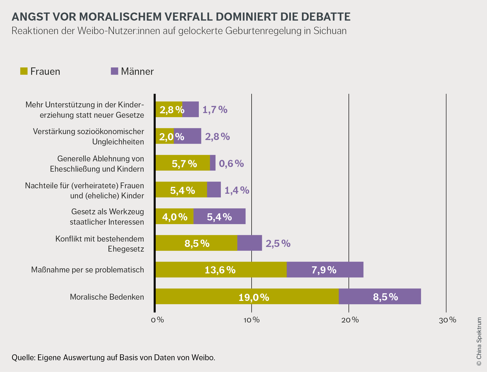 Eine Analyse von 304 viel geteilten und kommentierten Beiträgen3 zu dem Hashtag „Provinz Sichuan schafft Ehepaar-Geburtenregistrierung ab“ (#四川省取消结婚生育登记) auf der Plattform Weibo zeigt: Auch wenn es bisher nur ein lokales Experiment ist, die große Mehrheit der männlichen und auch weiblichen Nutzer:innen lehnt die Lockerung der Geburtenpolitik für Unverheiratete ab. Die Nutzer:innen halten diese vor allem für einen Ausdruck moralischen Verfalls, den sie insbesondere auf den Untergang der „Institution Ehe“ zurückführen.