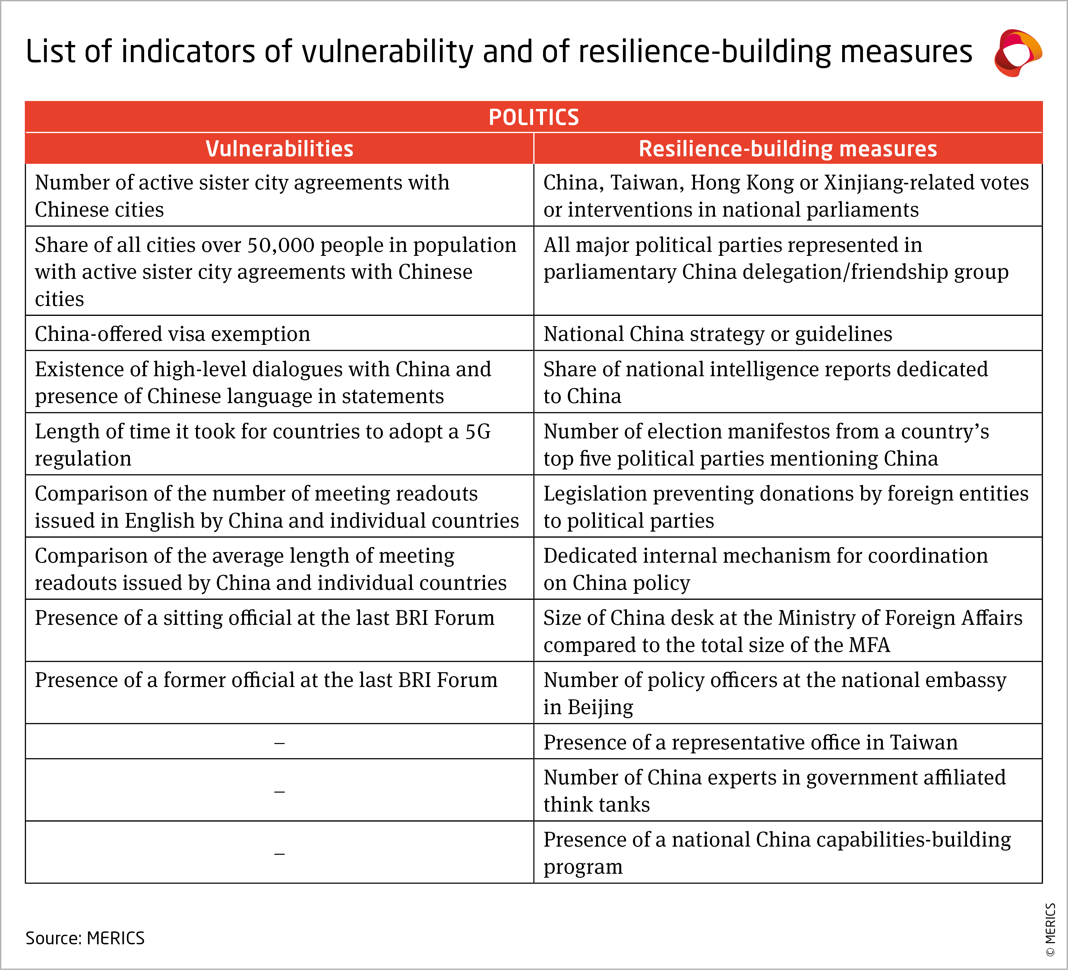 - Developing indicators: Creating indicators to assess countries' vulnerabilities to the defined means and evaluating the resilience-building measures deployed to increase the costs or hinder China’s ability to deploy those means.