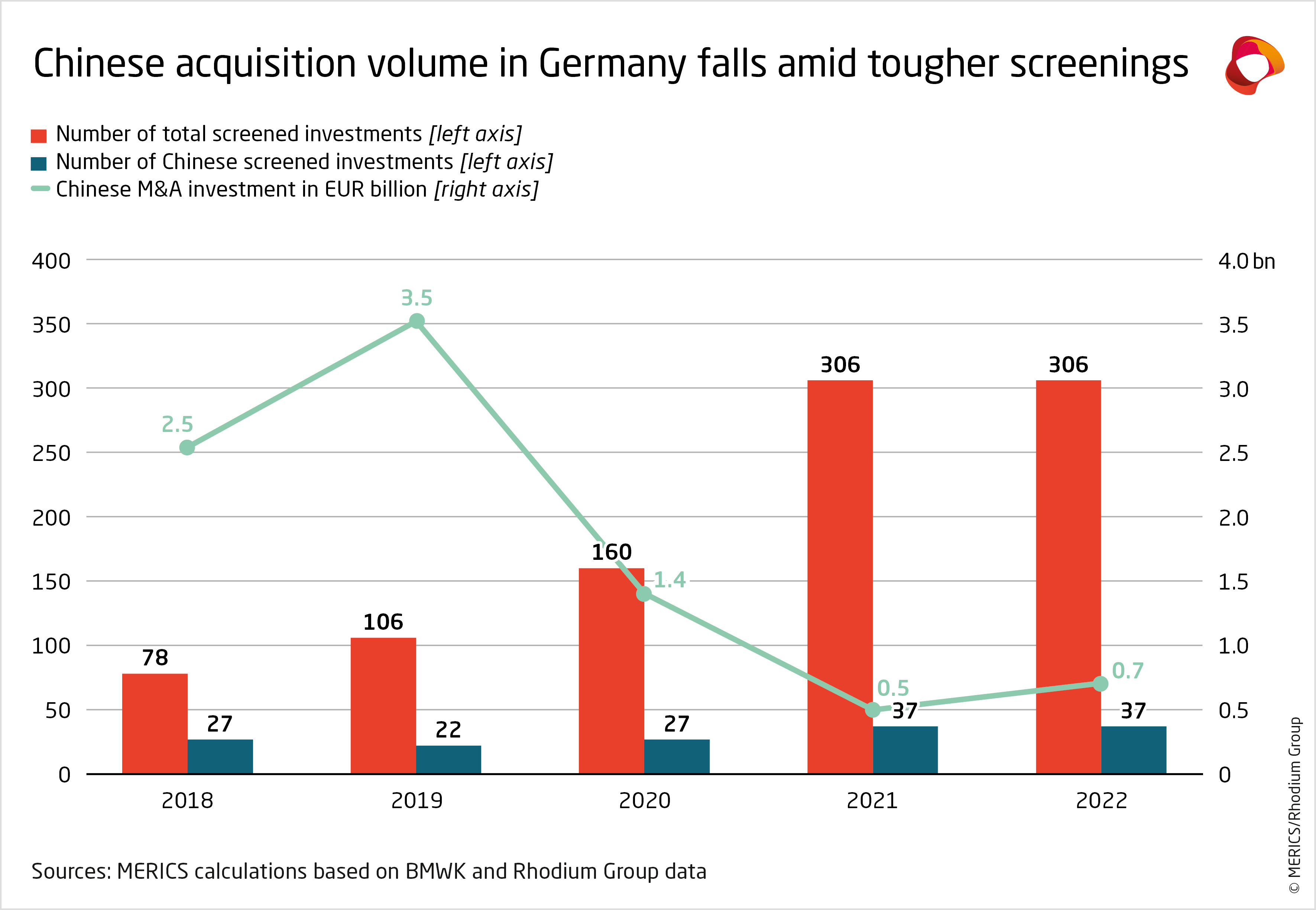 The German government has strengthened Germany’s investment screening regulation – the “Außenwirtschaftsverordnung” – several times since 2017 leading to an increase in the number of screened investments, including Chinese ones. This coincided with a downturn in Chinese M&A investment. While the total number of screened investments grew much faster than those of Chinese ones, there are indications, according to German media reports, that Chinese investments trigger particularly extensive screenings. At the end of March 2023, the German Ministry for Economic Affairs and Climate Action had initiated in-depth reviews for 11 investments. Of those 10 were from Chinese investors and one from Russia.