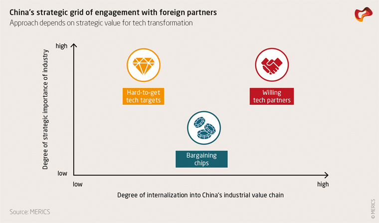 Bargaining chips: These are foreign companies in industries that China’s economic planners consider to be of lower strategic value. This is the case for consumer goods such as restaurant franchises or retail. The automotive sector has also moved into this category, as much of its production has already moved to China and is less important for further upgrading. Measures like dropping the joint venture requirement in the automobile sector are used by Chinese interlocutors as bargaining chips in reciprocity negotiations. But they are far less significant for foreign companies than they would have been a decade ago.