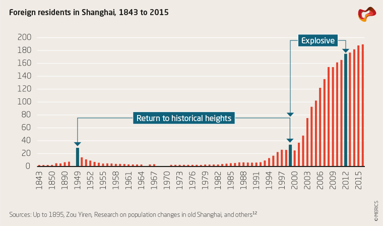 11 | See exhibit 2: up to 1895, Zou Yiren, Jiu Shanghai renkou bianqiande yanjiu (Research on population changes in old Shanghai), Appendix, Table 46, p. 145; post-1949 to 2000, He Yaping, Shanghai guojihua renkou yanjiu (Research on the internationalization of the pop- ulation of Shanghai), Tables 4-6, p. 88; post-2000, Shanghai Statistics Bureau; post-2013, estimates based on total foreign residents and the average share of those who stay over six months between 2010 and 2013 (about 50 %).