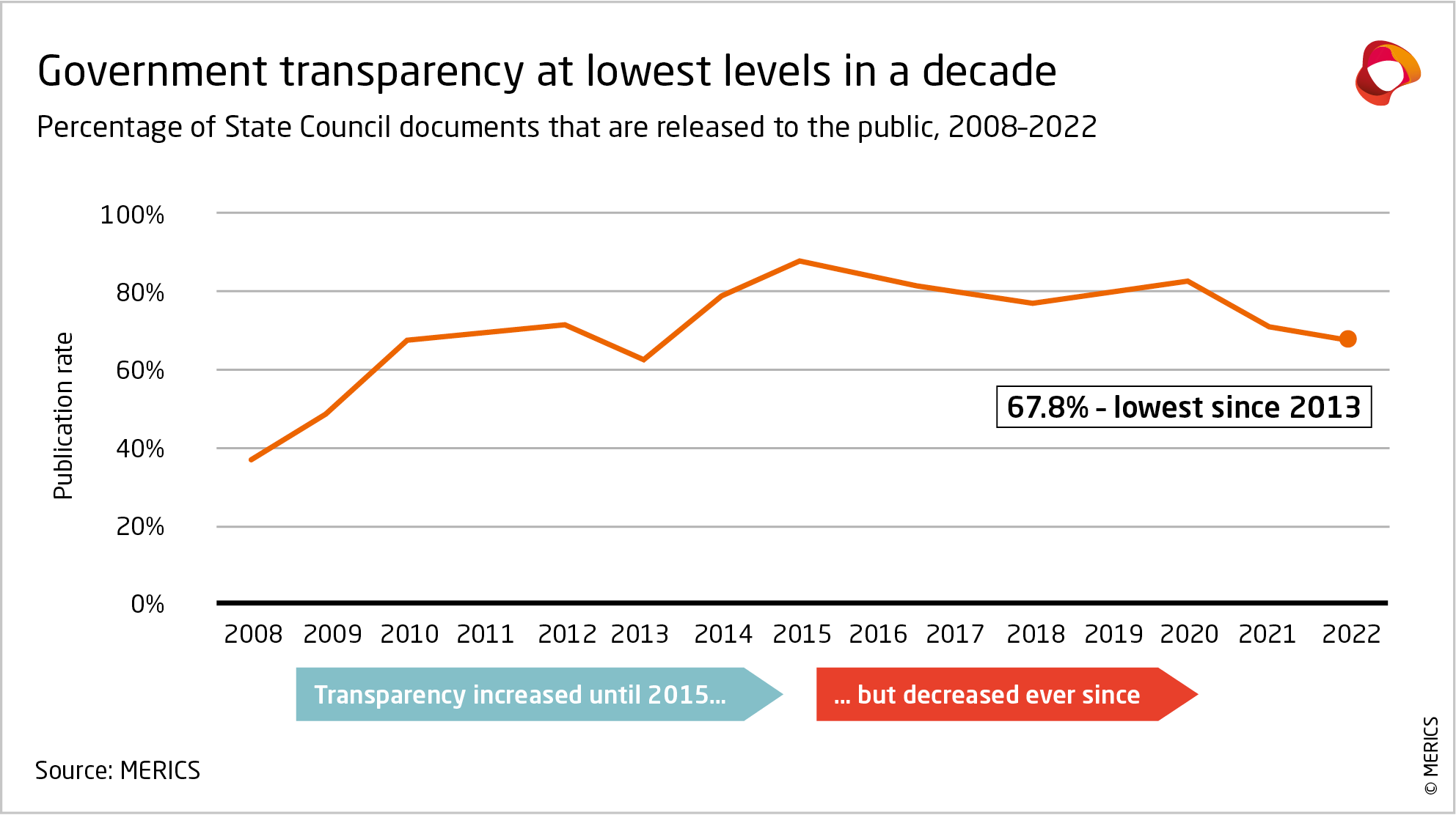 Closely following these trends, actual policy transparency improved until 2015, especially during Xi Jinping’s first presidential years. After its peak in 2015, however, publication of top-level documents by China’s State Council15 decreased from 88 to 68 percent in 2022 (exhibit 2). Variation between individual years occurs as political cycles affect policy-making processes, such as with Xi’s ascension in 2013, but the steady downward trend suggests that the decrease in transparency is systematic.