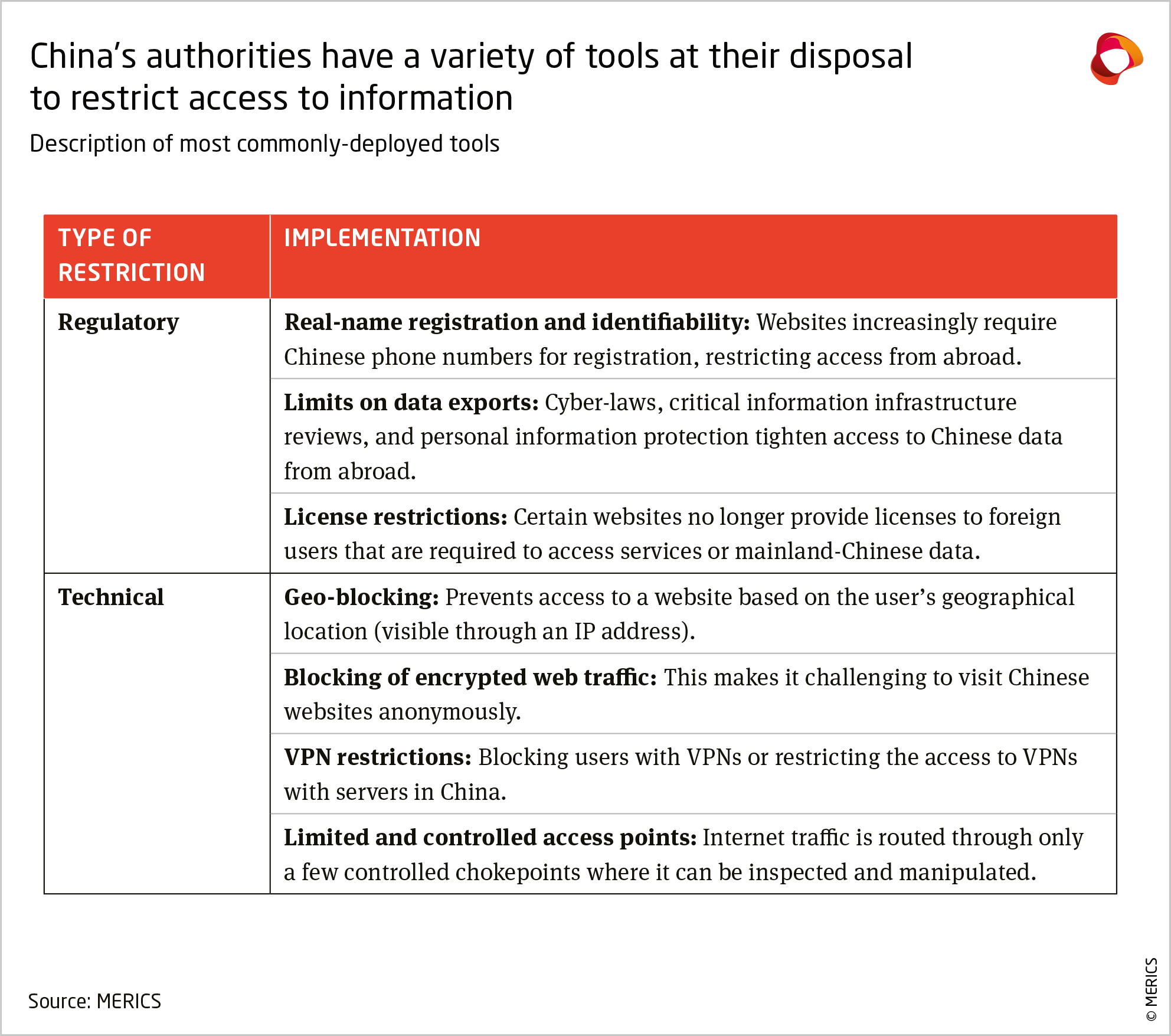 Following these principles, China’s internet bodies developed further technical and regulatory means to control and limit information access from abroad. This has led to the disappearance of selected online resources, insurmountable registration requirements for social media platforms or technical access restrictions to websites. Table 2 displays an overview of technical and regulatory means that either restrict access from abroad or lead to a specifically “curated” version of information for foreign users.