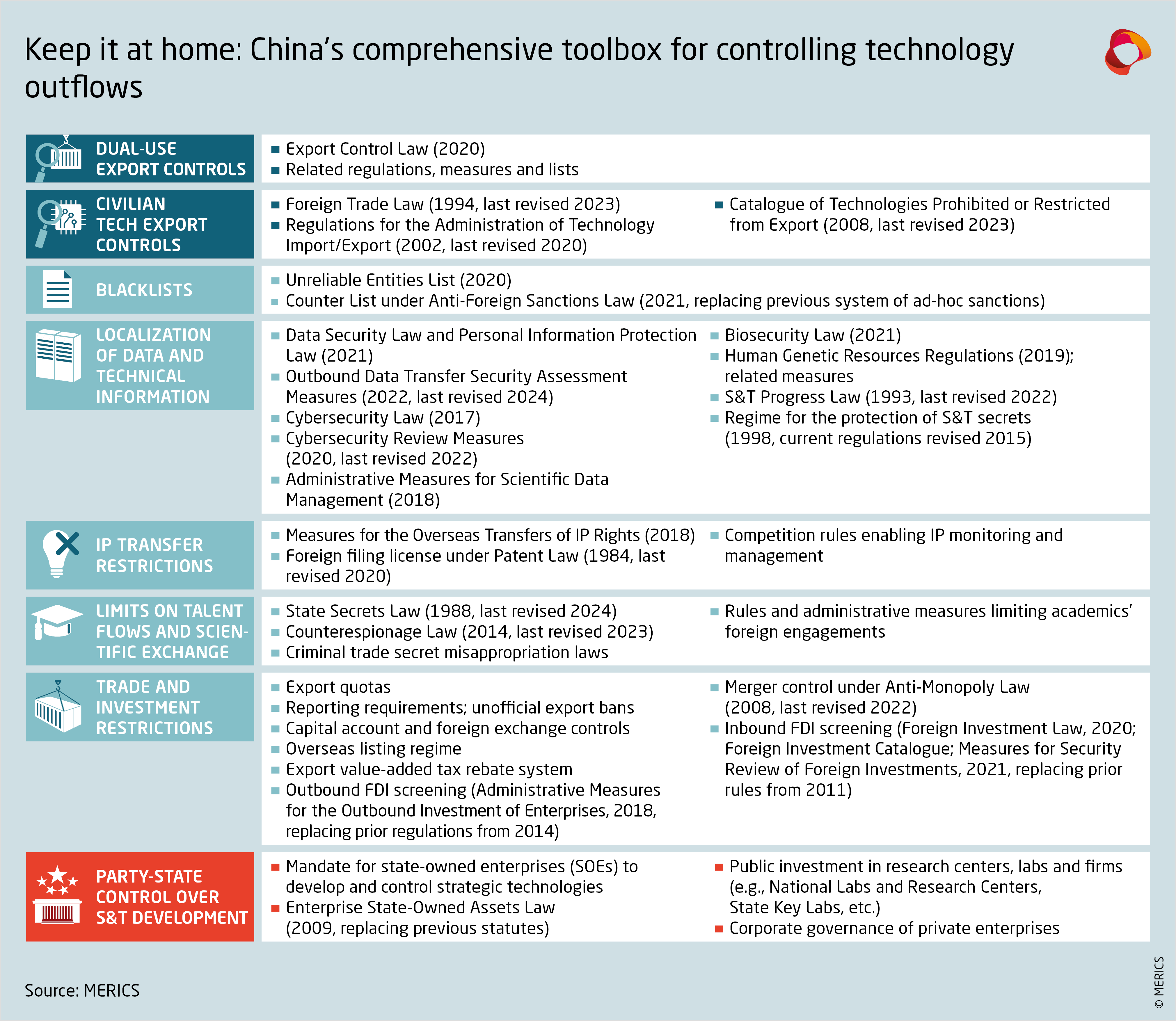 - In a shifting geopolitical environment, China’s government is sharpening and testing its tools for controlling technology-related outflows. As domestic firms climb up value chains, there is increased emphasis on controlling foreign access to retain critical innovation capacity within China.