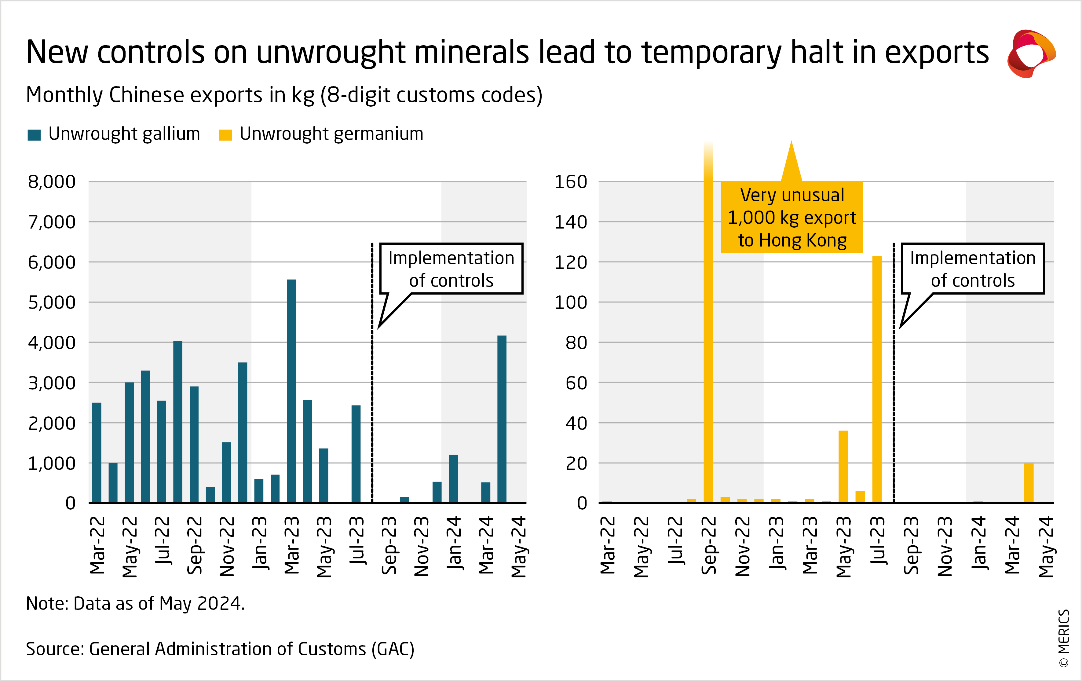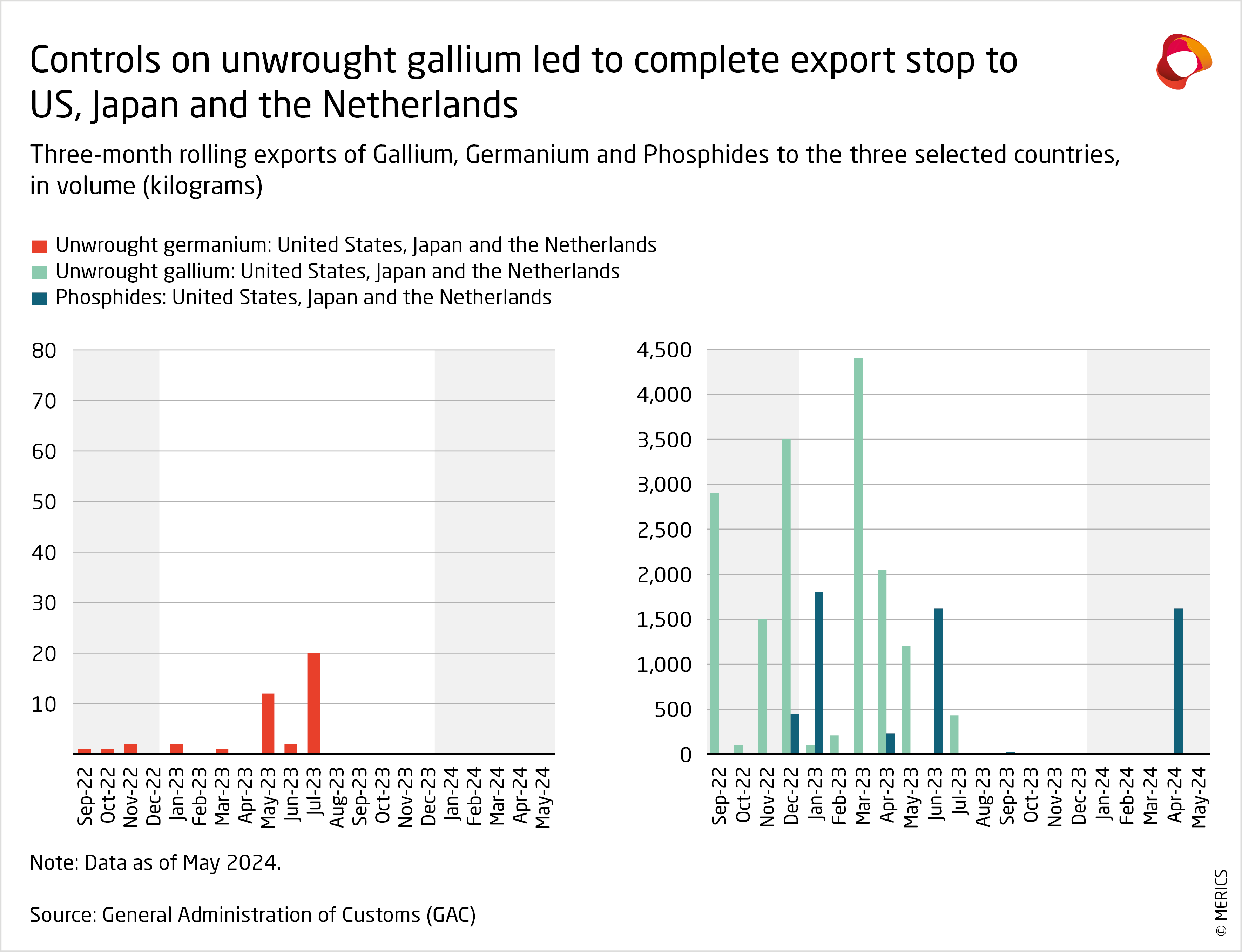 1 | Ministry of Commerce of the PRC (2023). “商务部 海关总署公告2023年第23号 关于对镓、锗相关物项实施出口管制的公告 (Announcement No. 23 of 2023 of The Ministry of Commerce and The General Administration of Customs on The Implementation of Export Controls on Gallium and Germanium Related Items.” July 3. https://archive.is/bNZpf. Accessed: July 23, 2024; Seaman, John (2023). “China’s Weaponization of Gallium and Germanium: The Pitfalls of Leveraging Chokepoints.” French institute of international relations. July 27. https://www.ifri.org/en/publications/briefings-de-lifri/chinas-weaponization-gallium-and-germanium-pitfalls-leveraging. Accessed: July 23, 2024.