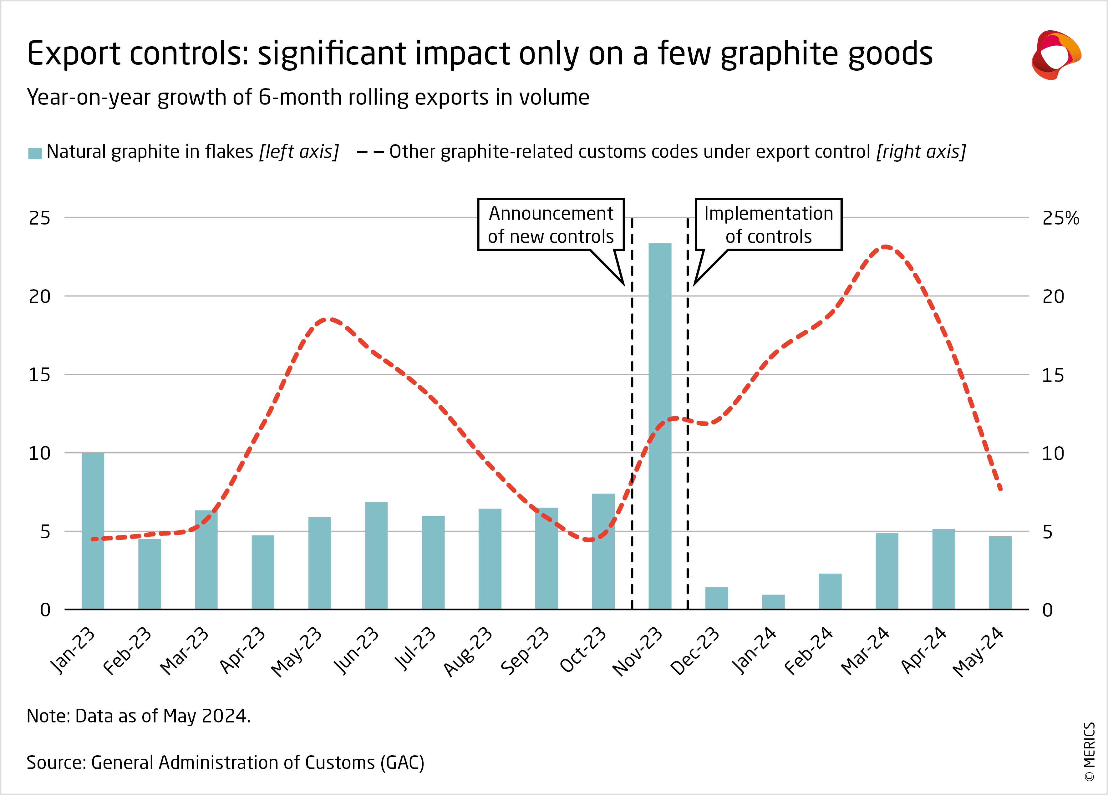 Against this backdrop, it is hardly surprising that the announcement of the new measures in October 2023 led to massive orders by OECD countries, especially those that are striving to shift battery and EV value chains away from China. G7 countries and South Korea saw the biggest frontloading and subsequent drop in Chinese sales of both spherical and natural graphite. The United States and Japan even had an unprecedented month of zero imports in December, possibly indicating that the authorities were delaying licenses for imports to those countries.