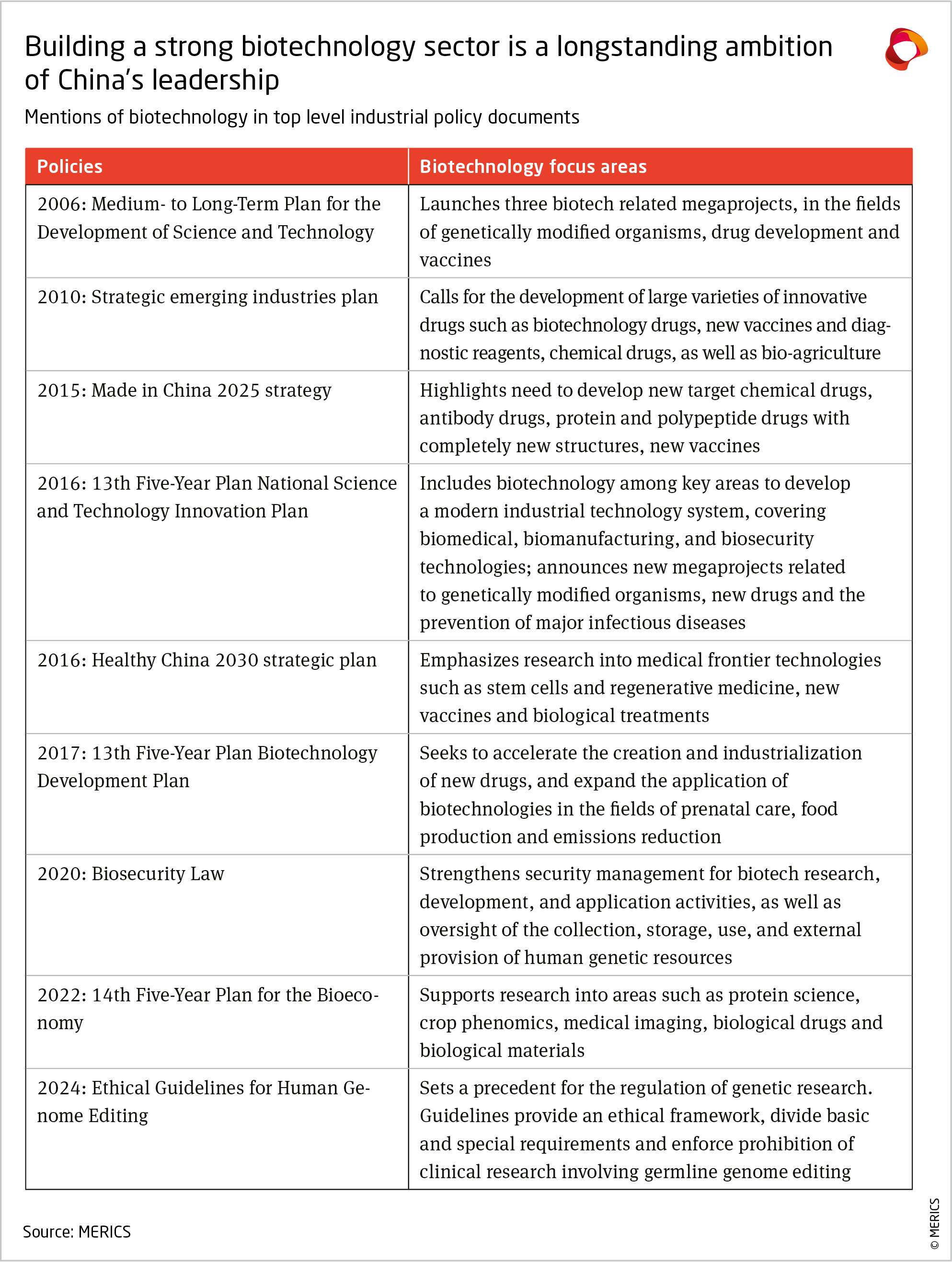 This report explores the goals, trends and international ties of China’s biotech sector, to help inform Europe’s own strategy on biotechnology. Europe already has a strong foundation, with several firms among the world’s leaders.7 Both strengthening domestic capabili- ties and finding the right balance between engagement and risk mitigation with China will be crucial for Europe’s long-term success.