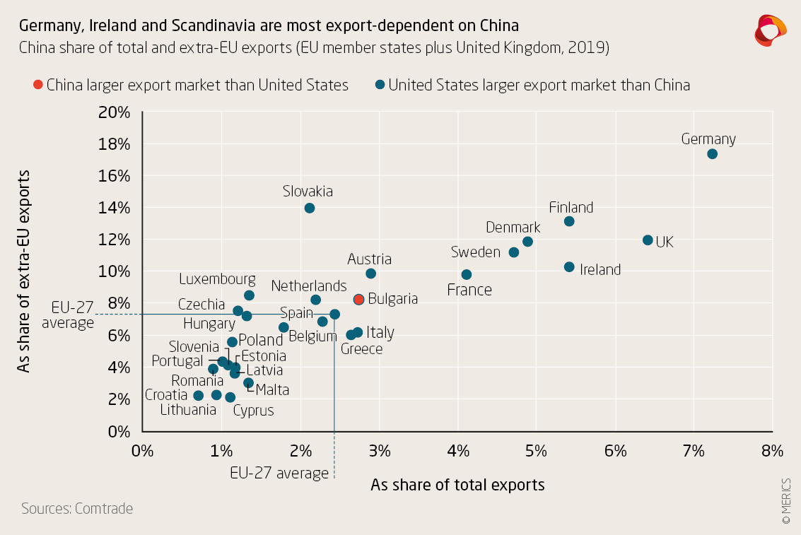 But these figures need to be seen in relation to the EU’s overall trade structure. Only 7.2 percent of German exports went to China in 2019. The share of Germany’s exports that went outside the single market was 17.4 percent, far above the EU-27 average of 7.3 percent.