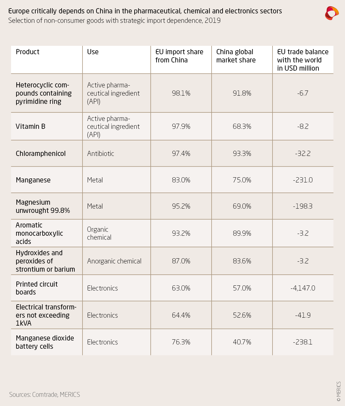 - There are 103 product categories in electronics, chemical, minerals/metals, and pharmaceutical/medical products in which the EU has a critical strategic dependence on imports from China.