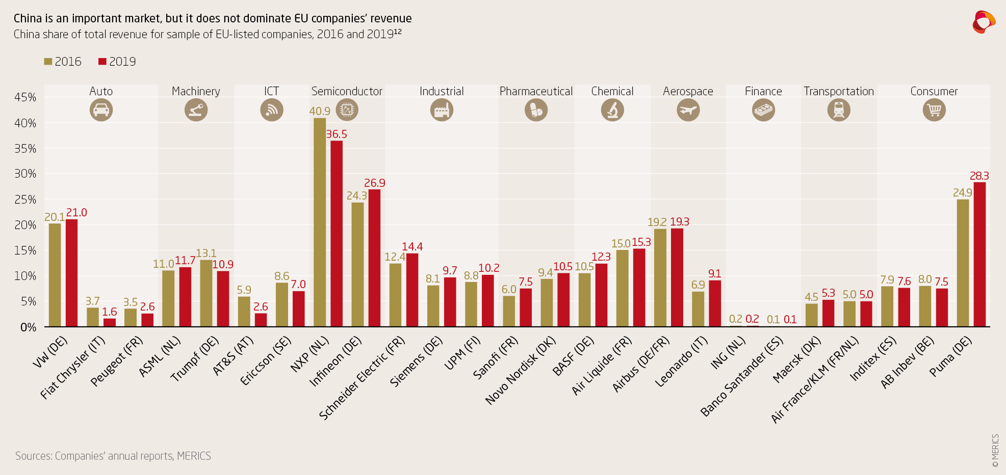 12 | The revenue share from China for Volkswagen, Peugeot, NXP, BASF, Air Liquide, Airbus, Leonardo, Air France/KLM, Inditex, and AB Inbev was not published separately in annual reports. It was therefore estimated using other China-related information provided in the annual reports.