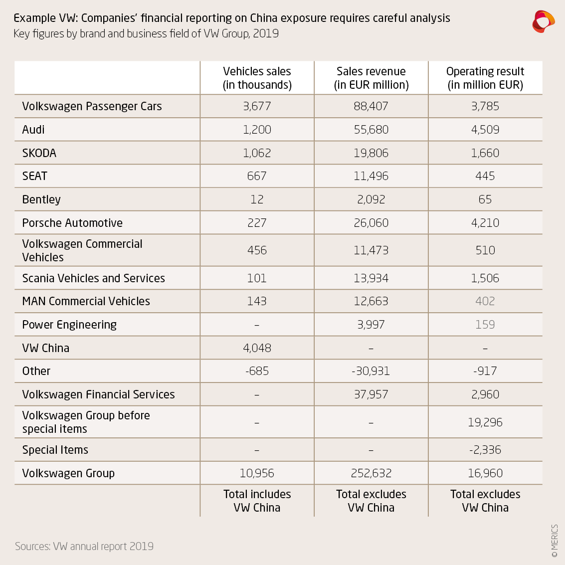 11 | The sales revenue is estimated using per unit sales revenue for different brands as stated in the annual report. The revenue of the vehicles exported to China are accounted for by 100 percent, while the locally produced vehicles revenue share is in proportion to the 40 percent equity stake VW holds in the VW China Group.