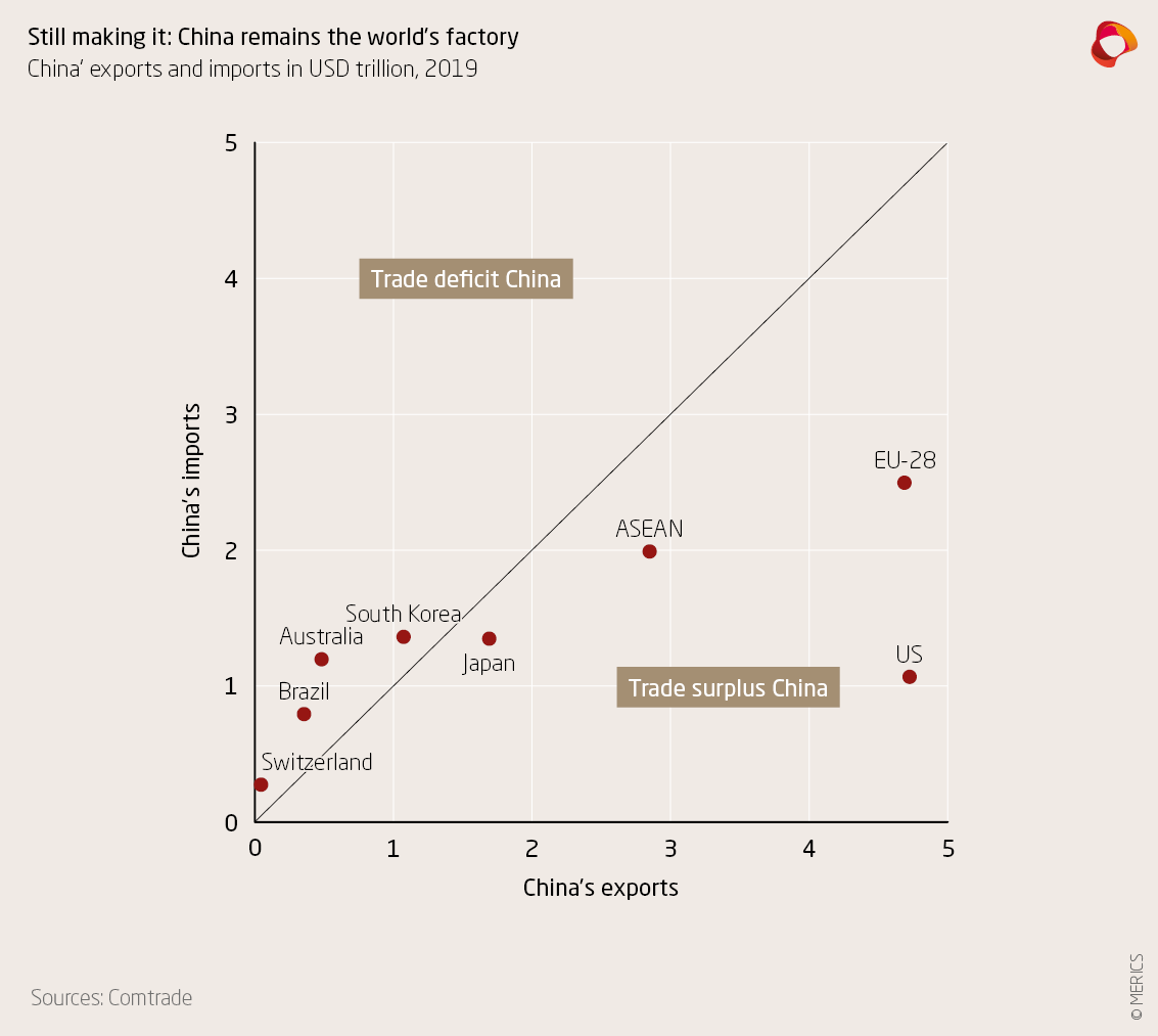 Even big Chinese corporations still tend to largely produce in China while their international manufacturing activities are still underdeveloped (although they also have international supply chains). Meanwhile, the countless export-oriented small and medium sized enterprises in the major export hubs in Guangdong, the Yangtze River Delta and Fujian rely heavily on the European market.
