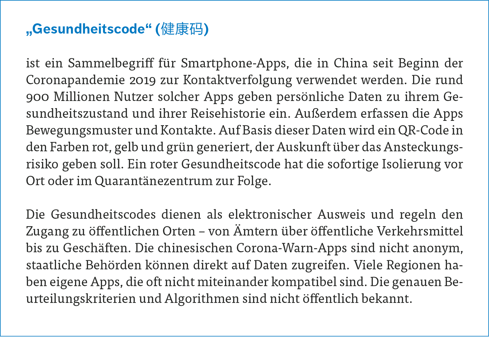 Die Netzbürger:innen konzentrieren sich fast ausschließlich auf Defizite in der Umsetzung der Gesundheitscodes und kritisieren lokale Willkür. Die Nutzung digitaler Kontrollinstrumente durch die Regierung und die weitreichenden staatlichen Befugnisse im Zugriff auf personenbezogene Daten thematisieren sie indes nicht. Dies zeigt die roten Linien für Diskussionen, die von Seiten des Staates gesetzt werden.