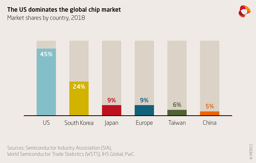 Although it is not 100 percent, almost half of the 155 billion USD global semiconductor market is dominated by US companies, according to the Semiconductor Industry Association. The US government is using the dominance of its chip manufacturers as a further weapon to isolate telecom supplier Huawei from international supply chains. The US Department of Commerce amended the so- called "Foreign Direct Product Rule" in mid-May 2020. The rule allows the US government to restrict the use of US technology by foreign companies for military or national security products. Foreign manufacturers also have to apply for export licenses for many chips if they produce semiconductors using US-developed machinery or software and intend to supply chips to Huawei.