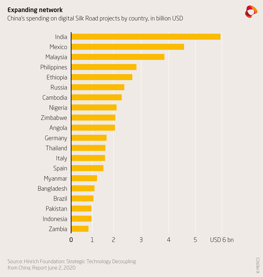 However, the impact of the BRI’s so-called "new Silk Roads" is not limited to conventional transport routes. Even more important are the "digital Silk Roads" in cyberspace, which China could control through the domination of 5G, the fifth generation of the mobile phone standard. The 5G technology is set to become a central hub of the global digital economy, thereby creating new dependencies. „Huawei‘s 5G networks will be at the heart of an ecosystem of Chinese technology companies which the Chinese Communist Party (CCP) is using to build a digital Silk Road,“ has warned Alex Capri, Research Fellow at the Hinrich Foundation in Hong Kong, in a report entitled „Strategic Technology Decoupling from China.“ Capri foresees China’s major tech players gaining dominant positions in Silk Road regions. China’s Beidou satellite network would provide the GPS services to entire regions; Alibaba and Tencent would enable cloud and e-commerce services; other large Chinese companies such as Hikvision and Dahua Technology (a maker of facial recognition CCTV), SenseTime and Megvii (artificial intelligence, AI) would be building the AI and data analysis frameworks.