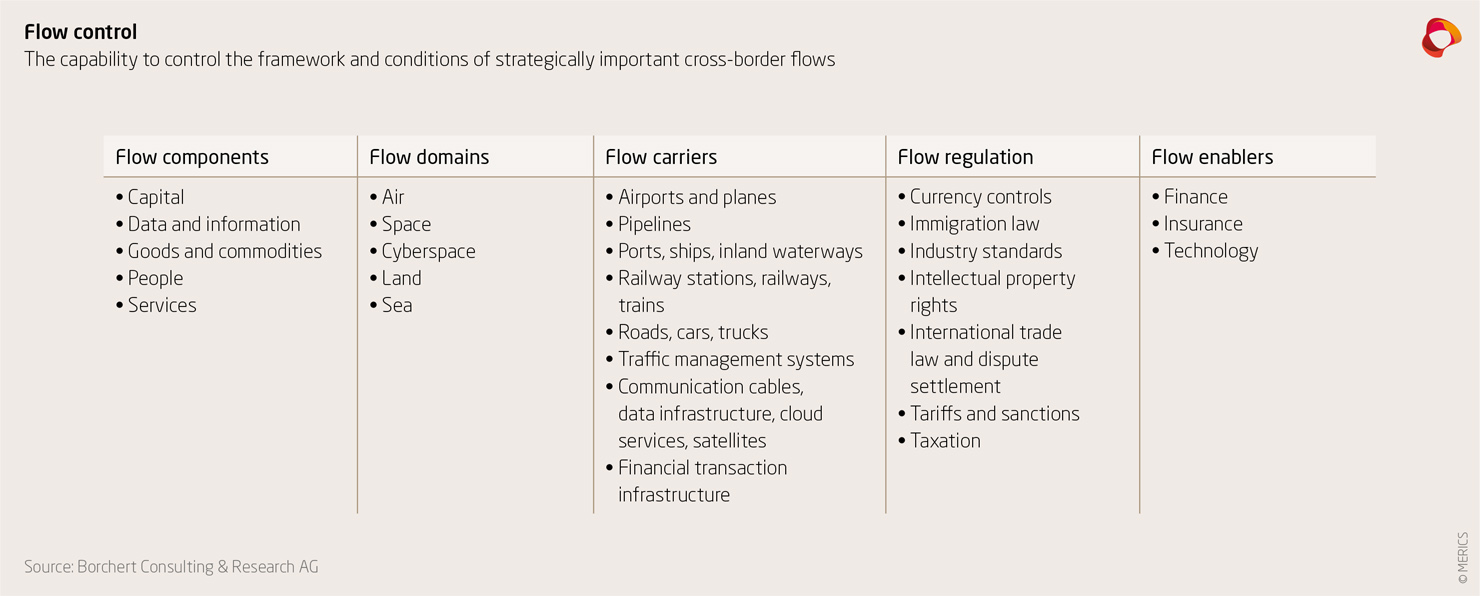 The Swiss management consultant Heiko Borchert, who does intensive research on how geopolitical changes impact companies, calls this "flow control." The phrase denotes a country‘s ability to control the framework and conditions for strategically important cross-border trade, financial, data and migration flows. "The most important instruments that have been used to date to connect nations – rules, international institutions, technical standards and economic relations – are now being turned against each other," Borchert has said. Ultimately, it is a matter of using these geo-economic "weapons" to assert geopolitical interests against other countries.