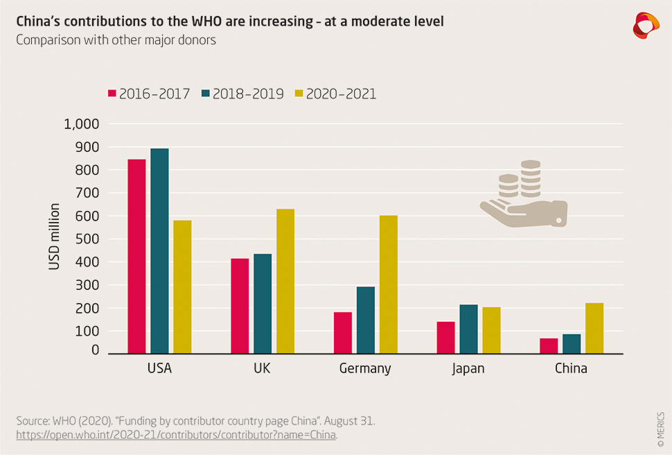 On global health, China used to keep a relatively low profile within the WHO, especially after it was criticized for covering up the 2003 SARS outbreak. Since 2017, however, China’s role has expanded, with financial contributions to the WHO having more than tripled to around 221 million USD for the 2020 - 2021 budgetary window.8 Controversies have arisen around China’s role in the WHO’s response to Covid-19 because of the way it stifled criticism about its own initially slow and opaque response to the virus’s outbreak in Wuhan. Its continued intransigence toward granting Taiwan observer status in the WHO’s World Health Assembly has further underscored worries that China’s political interests and values are at odds with the organization’s core global health mission.
