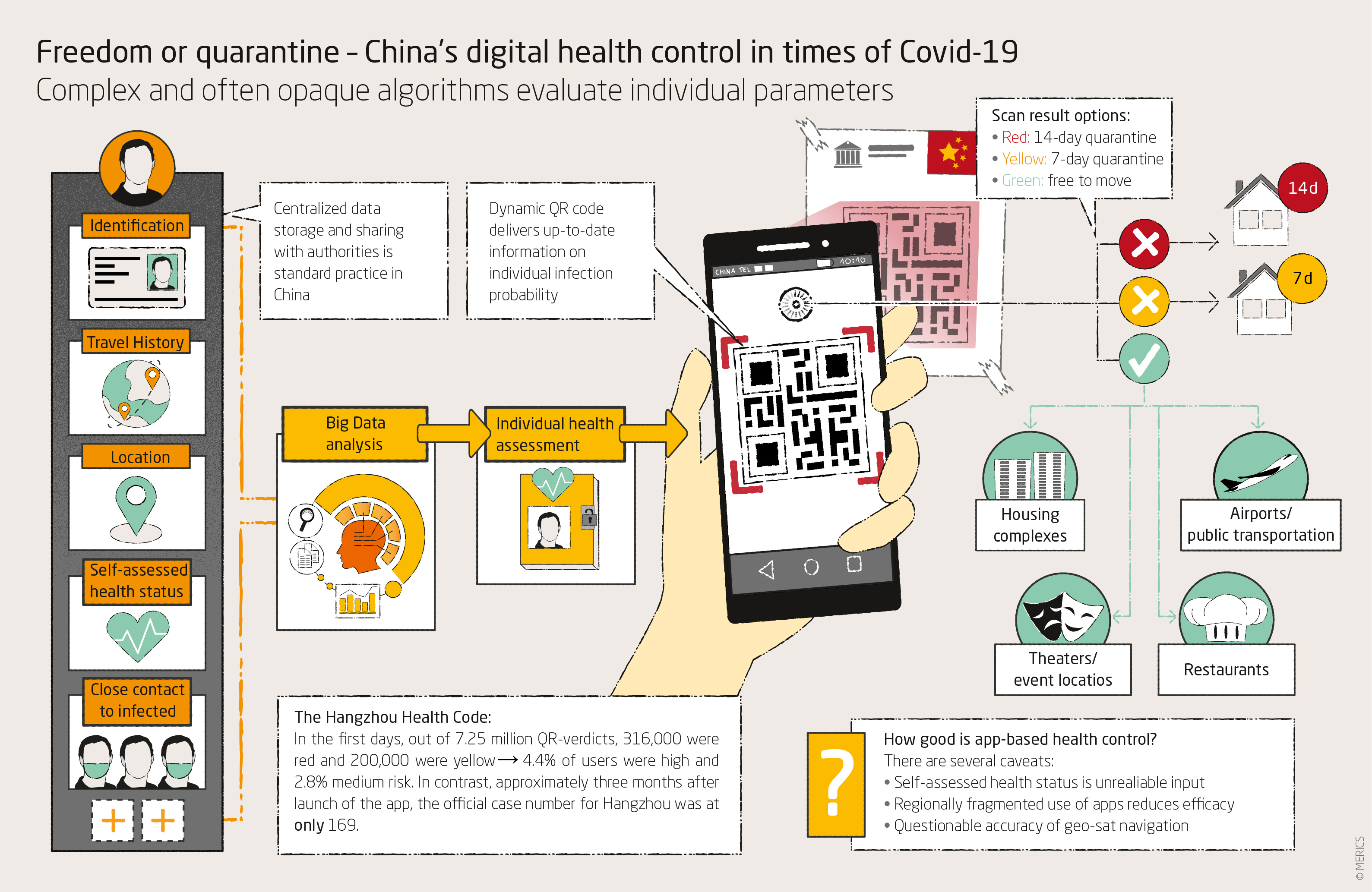 However, the Hangzhou city hotline received more than 50,000 complaints within the first week about inexplicable QR results, and several cities recorded QR app crashes in the following weeks. Alibaba and various project partners have subsequently made similar versions of the “Health Code” available in over 200 Chinese cities and on multiple platforms. The app is currently used by almost all of China’s 900 million internet users.3
