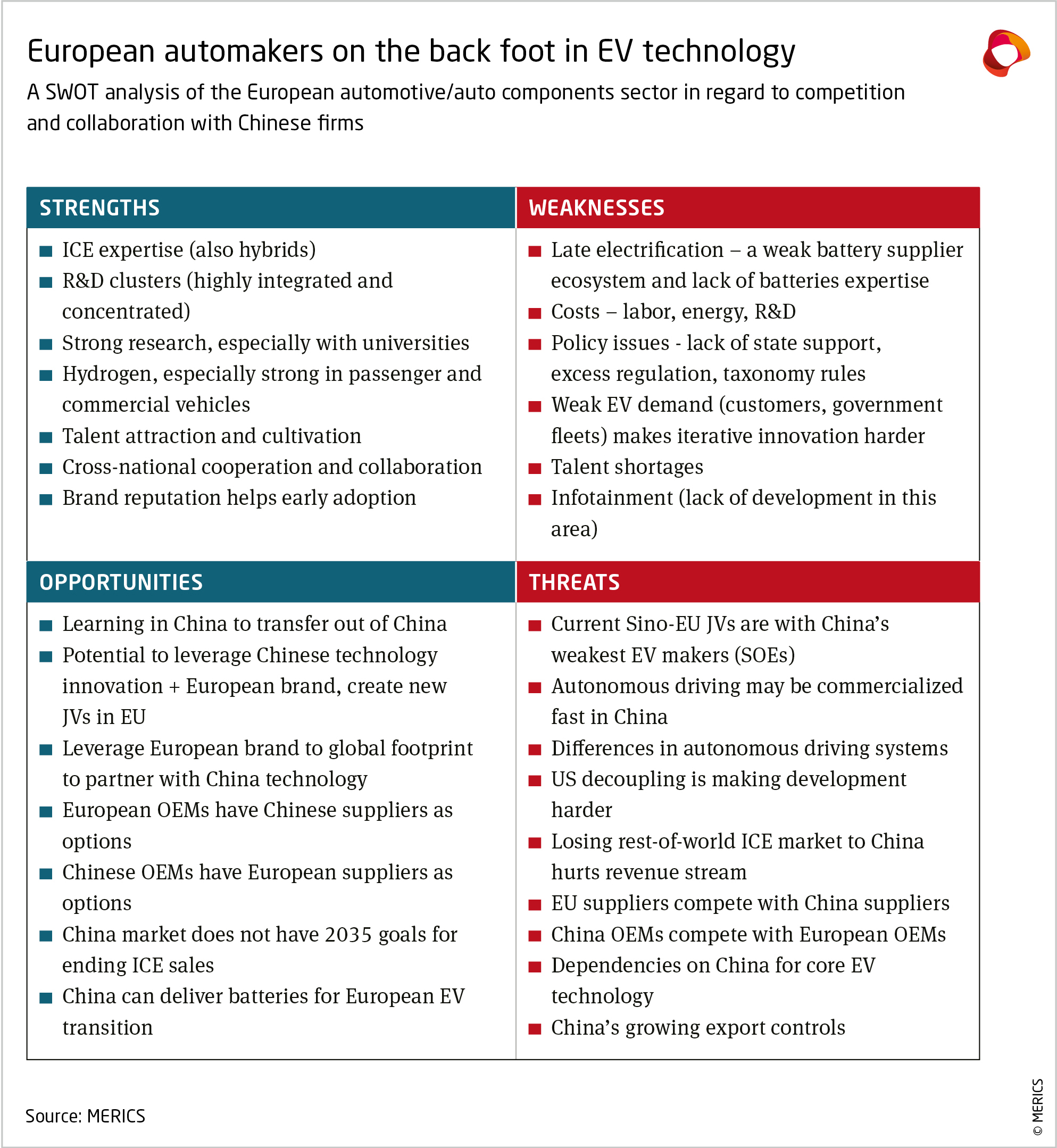 The European automotive sector is in a precarious competitive position, specifically in electrification, digitalization, and infotainment. Real opportunities for collaboration exist to help the industry make up for its weaknesses, and could bring more Chinese investment and technology to Europe. Doing so could help European players catch up, while increasing the risks of being undermined by China’s EV makers. Cooperation would boost dependencies on Chinese technology and supply chains and can inhibit European players from pushing for indigenous innovation and capacity.