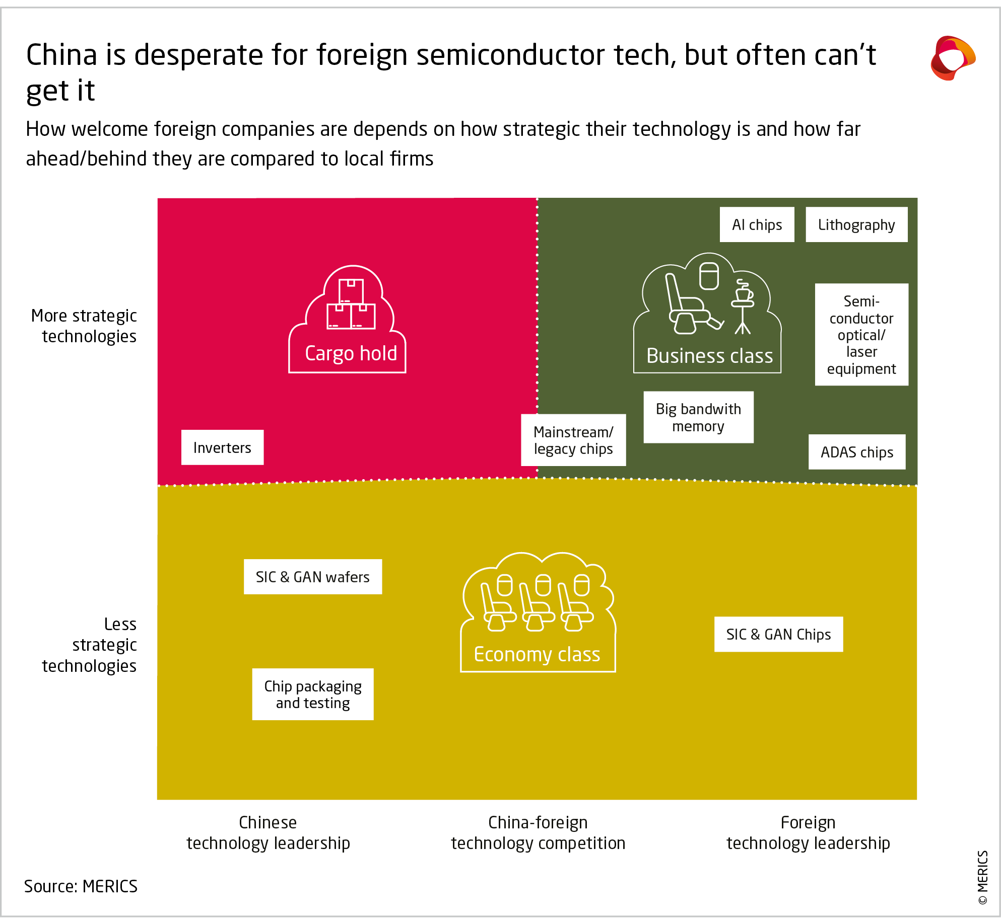 Firms in ‘economy class’ tend to have less uncertain fates. Beijing is largely ambivalent about foreign investment in their sectors – typically downstream in value chains and consumer-oriented goods – as the investment bolsters employment, tax revenue, HR development, etc. without taking market share from local firms that could be used to fund R&D in a strategic technology.
