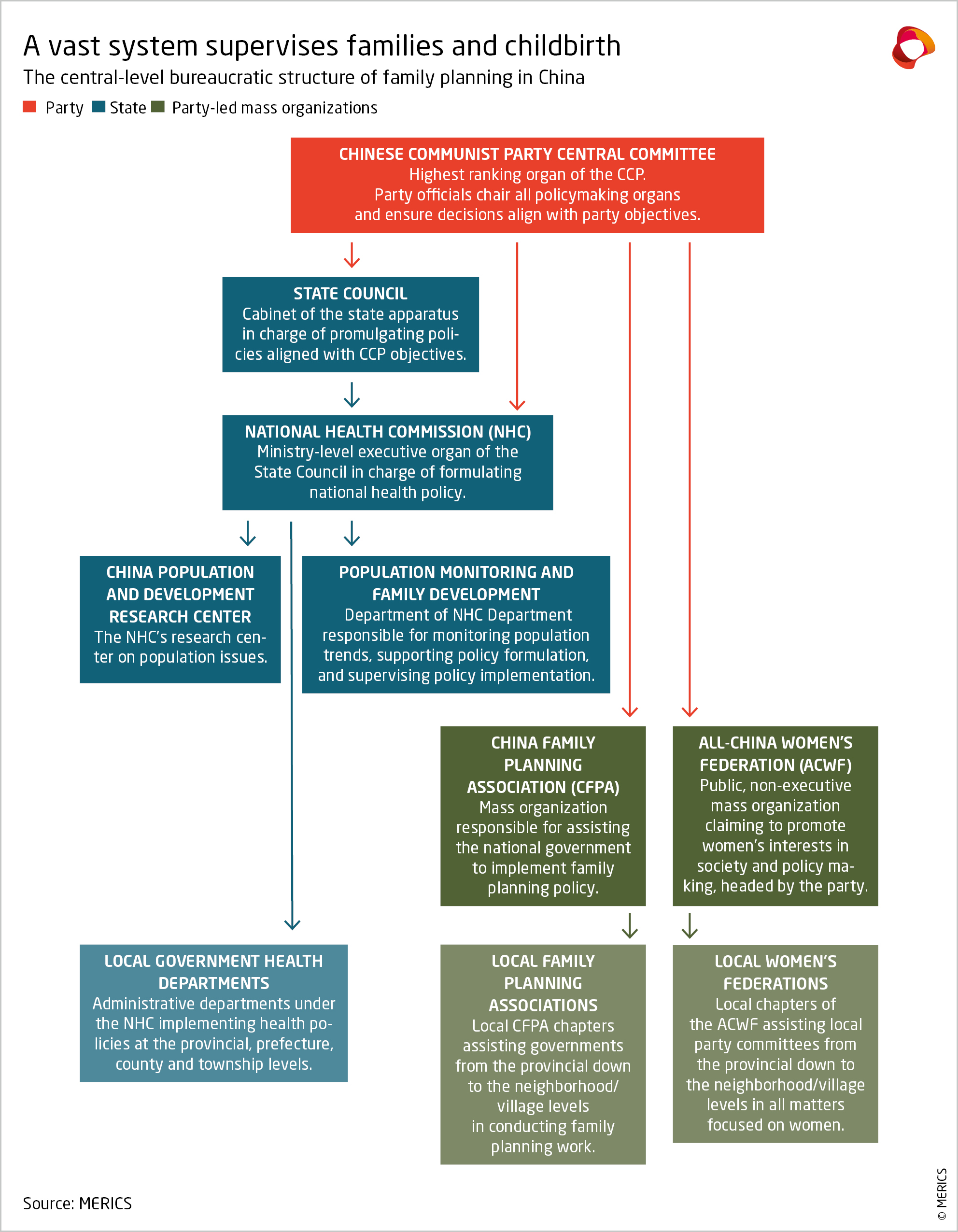 The China Family Planning Association (CFPA) and All-China Women’s Federation, both mass organizations under the leadership of the CCP’s Central Committee, have been in charge of delivering party messaging to the masses and ensuring central directives are implemented at the local level.