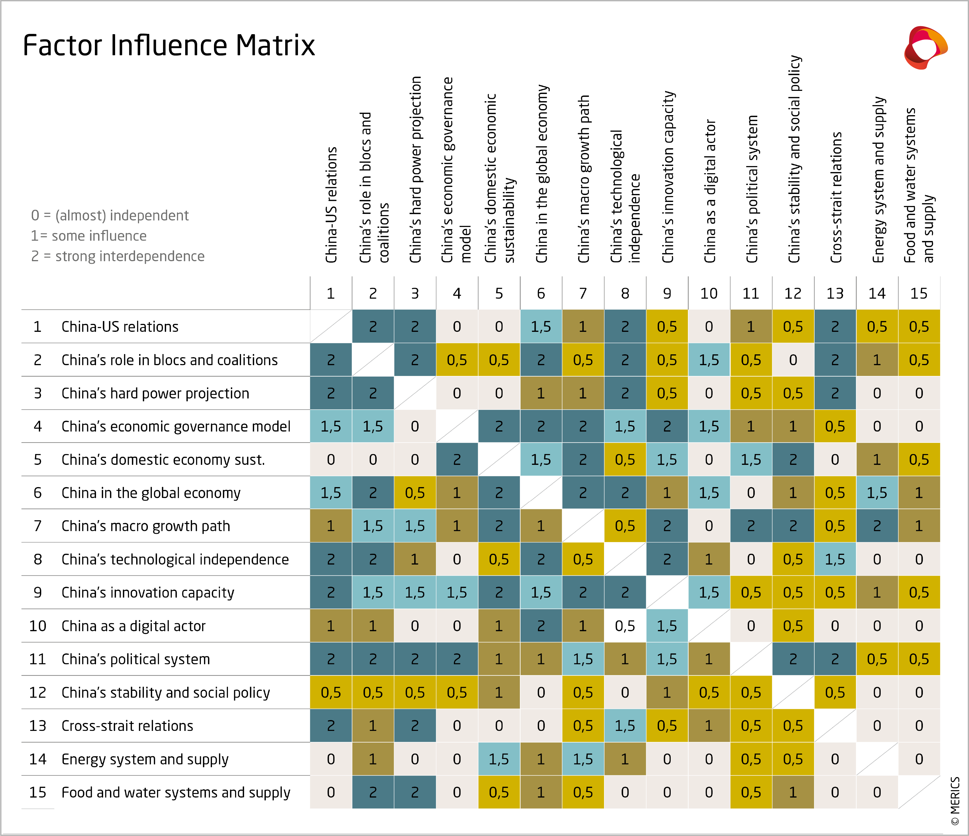 Methodologically, the scenarios were developed in several steps. The initial question was: "How might China develop during the five years of President Xi Jinping's third term in office, which lasts till 2027?" Over several workshops, this question was broken down a) into sub-areas relevant to overall developments b) for which reasonably precise assumptions or mini-scenarios could be developed. From the initial 40 areas, a set of 15 key factors was selected that could be used to draw a reasonably comprehensive picture of China’s development. They include political factors (such as the political system or China's role in the world), economic factors (such as growth paths or domestic and foreign economic developments) and technological factors (such China's technological independence).