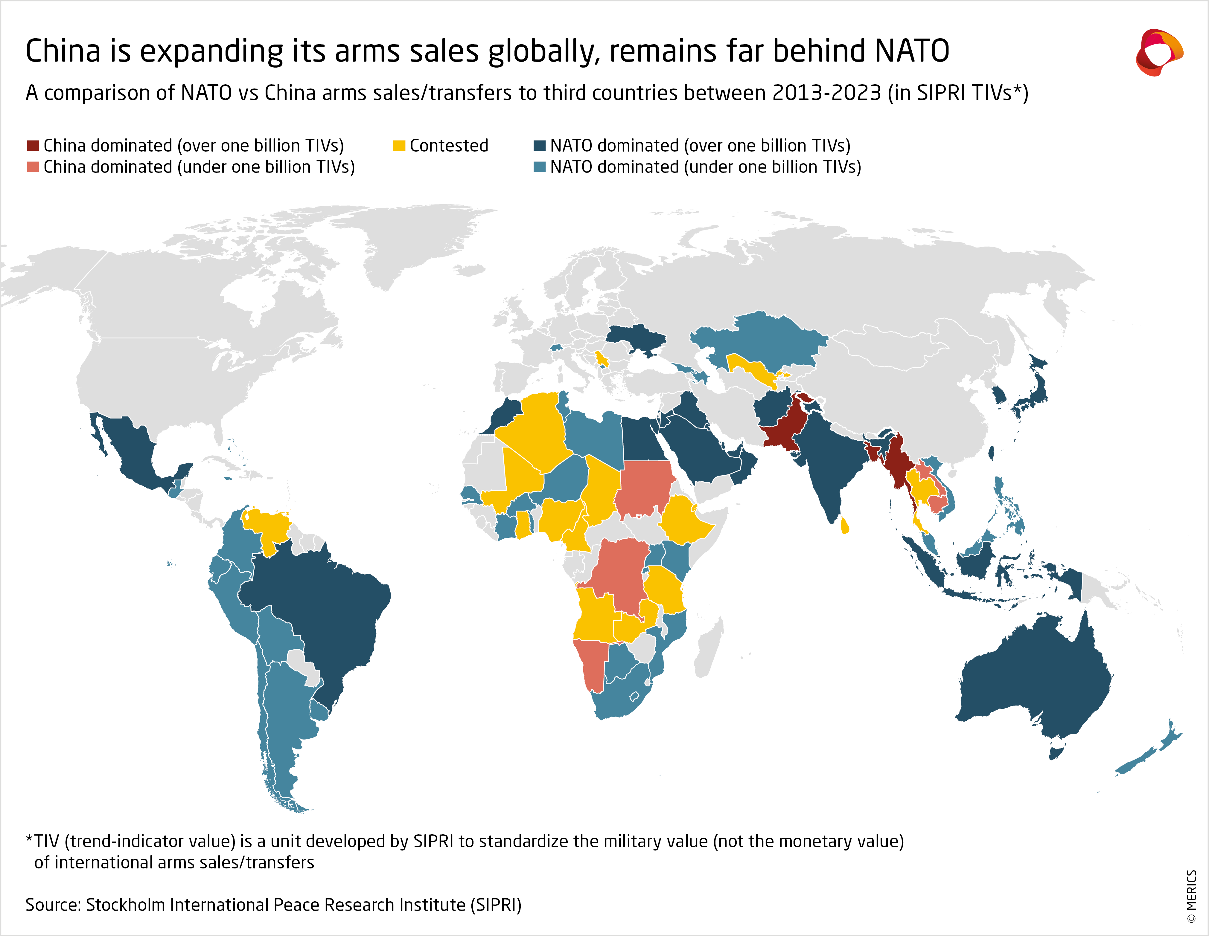 Below the surface, the numbers show most countries purchase the majority of their weapons either from China or from NATO allies, including Europe and the United States. However, there are a handful of notable exceptions. Pakistan and Thailand continue to buy from both China and Western suppliers, likely leveraging their status as NATO partners and US allies. Saudi Arabia, meanwhile, is the only country to appear in the top 10 recipients list for both China and NATO allies in the 10 years between 2013 and 2023. Nonetheless the difference in volume is staggering: 28,448 million in SIPRI’s trend-indicator values (TIV) from NATO allies compared to only 366 million from China.