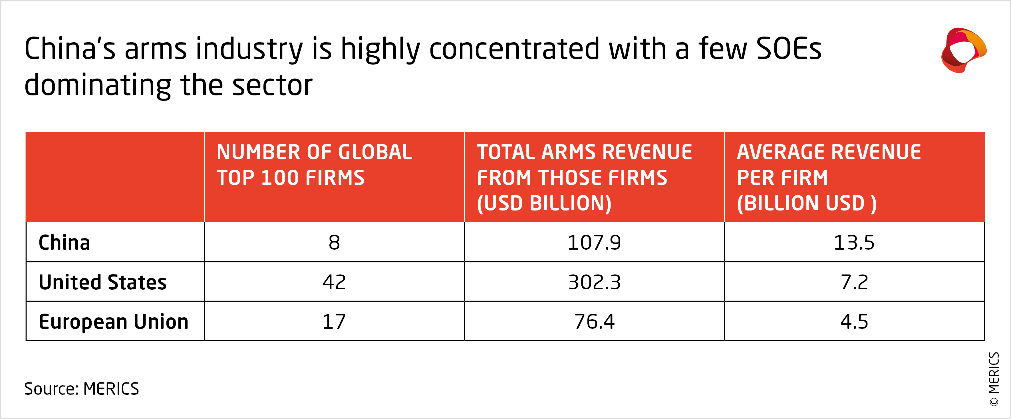 Like Norinco, other major Chinese arms manufacturers get only a minor share of their revenue from arms sales. Among China’s top five arms makers, the highest share of revenue derived from arms sales is around 44 percent at China Aerospace Science and Technology Corporation. At the others, it ranges between 25 percent to 32 percent. By contrast, among the top five US players, the lowest share of revenue derived from arms sales is around 44 percent at Boeing, with the highest share being 90 percent at Lockheed-Martin. European arms makers, likewise, are predominantly dedicated to arms production and adjacent civilian applications.