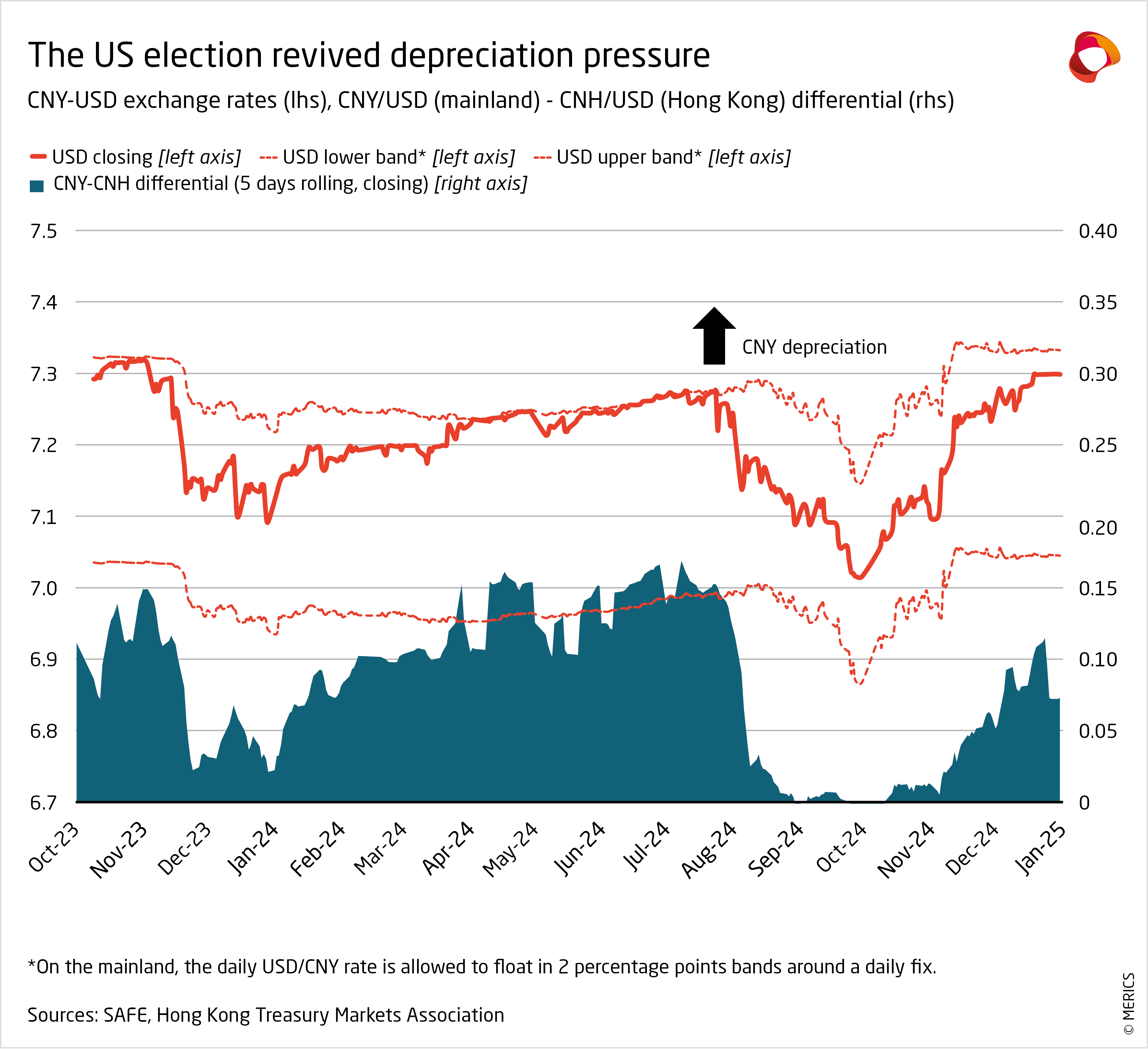 - Anticipating fresh trade frictions from the new Trump administration, Beijing has let the CNY depreciate significantly. Since early November and the result of the US election, the CNY has lost 3 percent of its value against the USD (see exhibit 9). But prospects of a weaker currency have increased capital outflow pressures. In Q4, the exit from the mainland financial market amounted to CNY 496 billion.