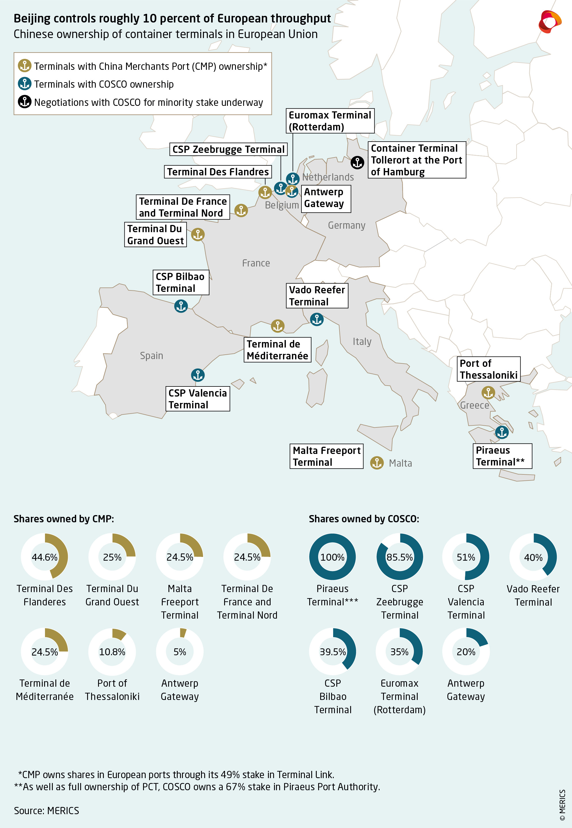 There are three Chinese companies involved in European ports: COSCO, China Merchants Port Holdings Company (CMP) (招商局港口控股), which is the world’s sixth largest terminal operator, and Hutchison Port Holdings Limited (Hutchison) – a private Hong Kong group that is the world’s number two operator. Of these, COSCO is the most relevant actor – it is the only operator that is also a shipping carrier, and it is the only state-owned Chinese actor with controlling shares in European terminals.