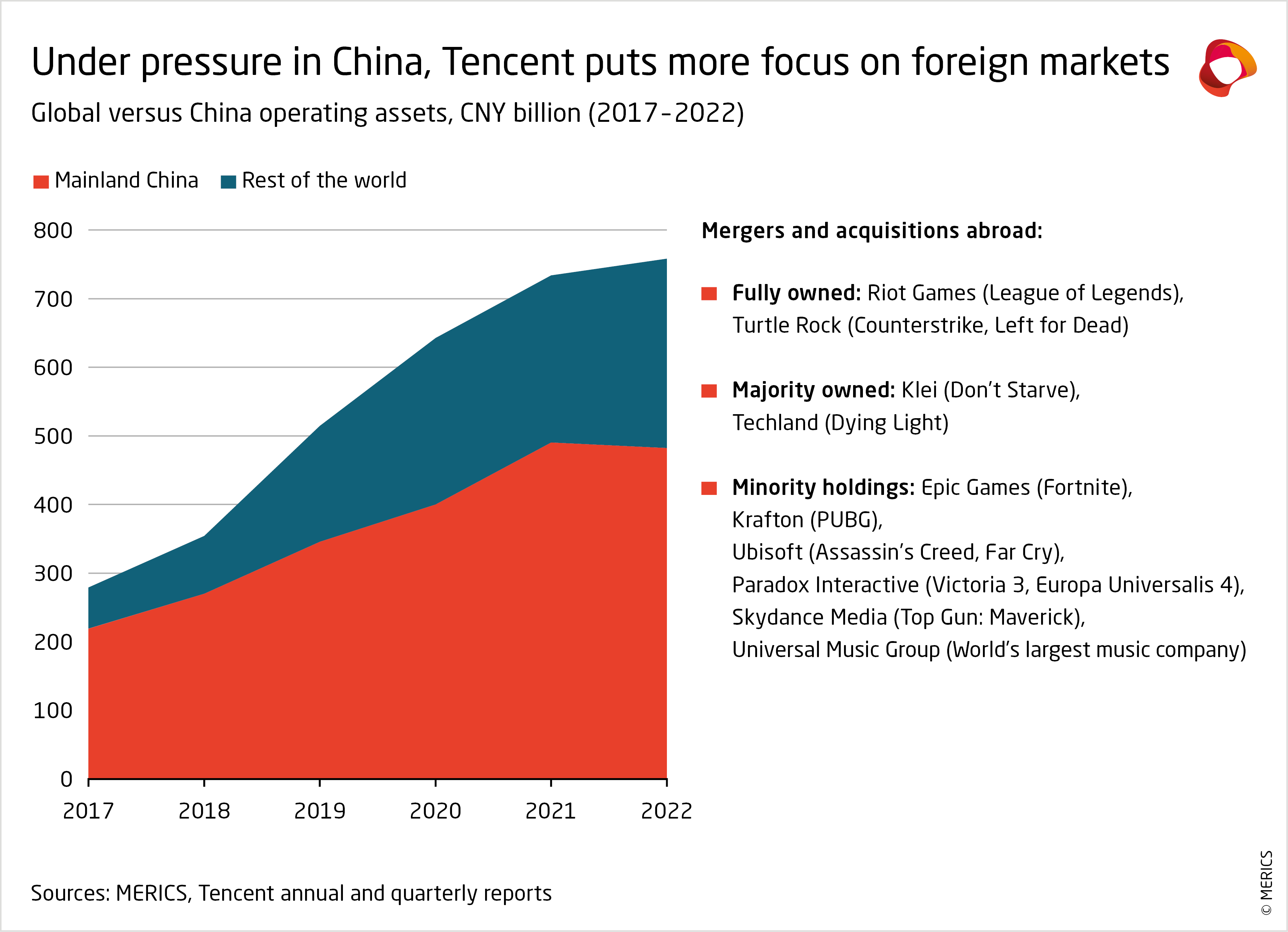 In 2022, Tencent’s overseas revenue was only one tenth of that generated in China and its domestic product offering far more varied. However, its international revenues (primarily gaming-focused) have grown much faster in relative terms. From 2017 to 2022, Tencent more than doubled its domestic revenues, from RMB 230 billion to RMB 503 billion, yet overseas revenue rose six and a half times, from RMB 8 billion to RMB 52 billion.