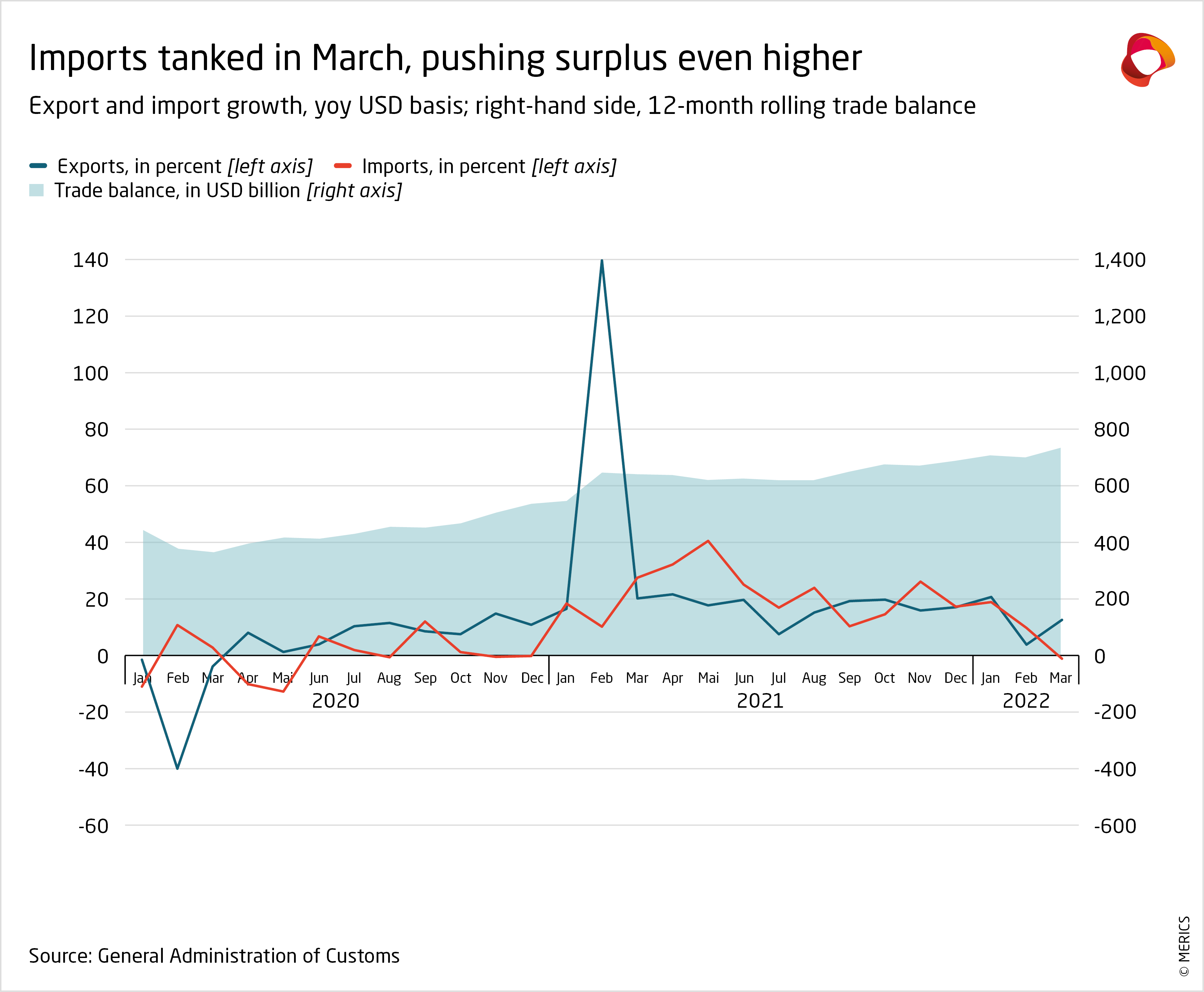 - In contrast, imports fell sharply over the first quarter. After 19.8 percent growth in January, imports showed a contraction of 0.1 percent in March. But the deteriorating picture in March reflected logistical issues rather than weaker demand. The lockdown in Shanghai has caused a massive backlog of cargo ships waiting to offload their goods.