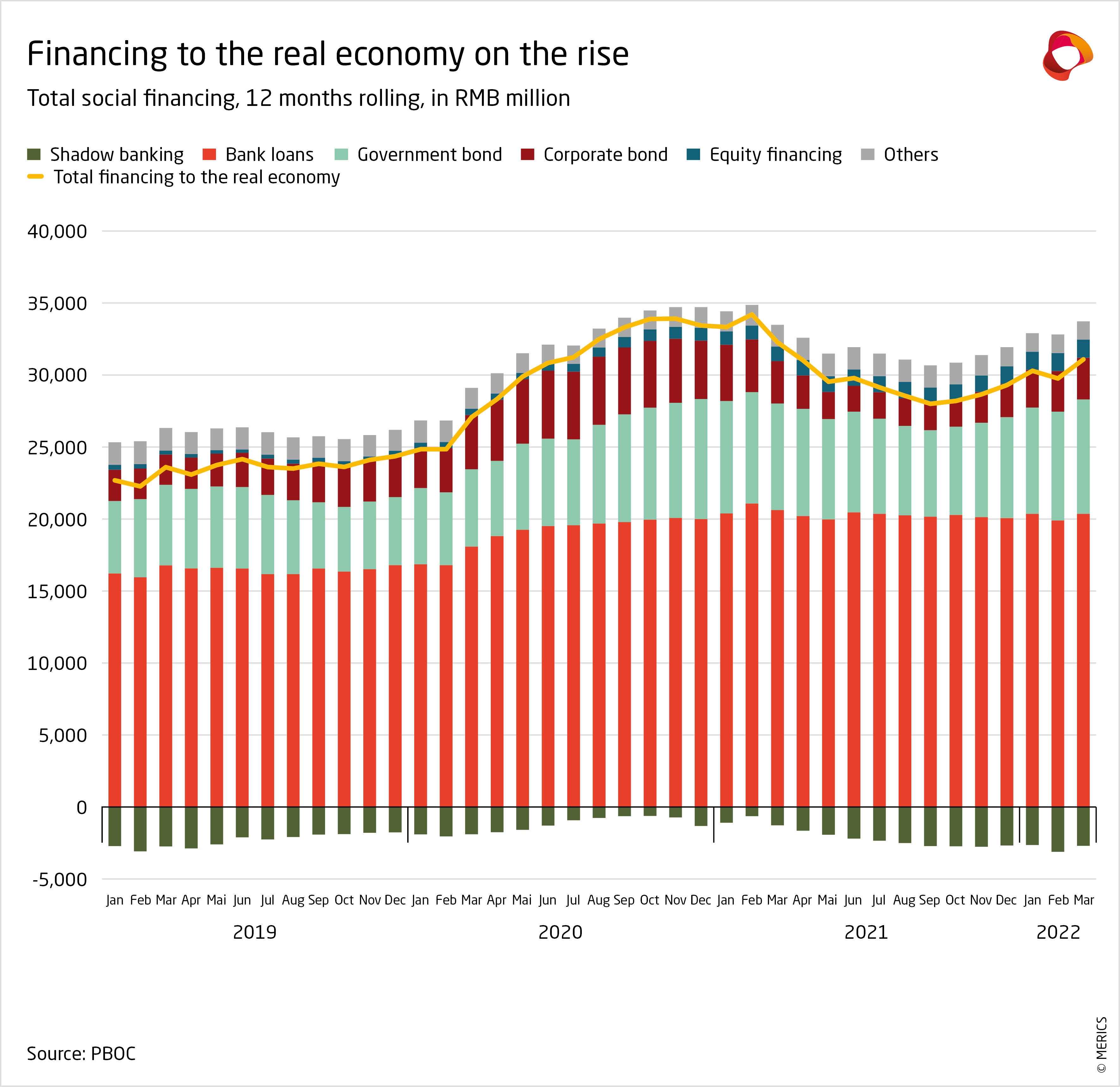 - Credit growth was led by strong bonds issuance. Government bonds reached RMB 1.6 trillion in the first quarter, more than twice the level in 2021. The spike indicates local governments are preparing to roll out new projects. Net corporate bonds increased by 44 percent year on year, shaking off market fears of defaults by struggling real estate developers.