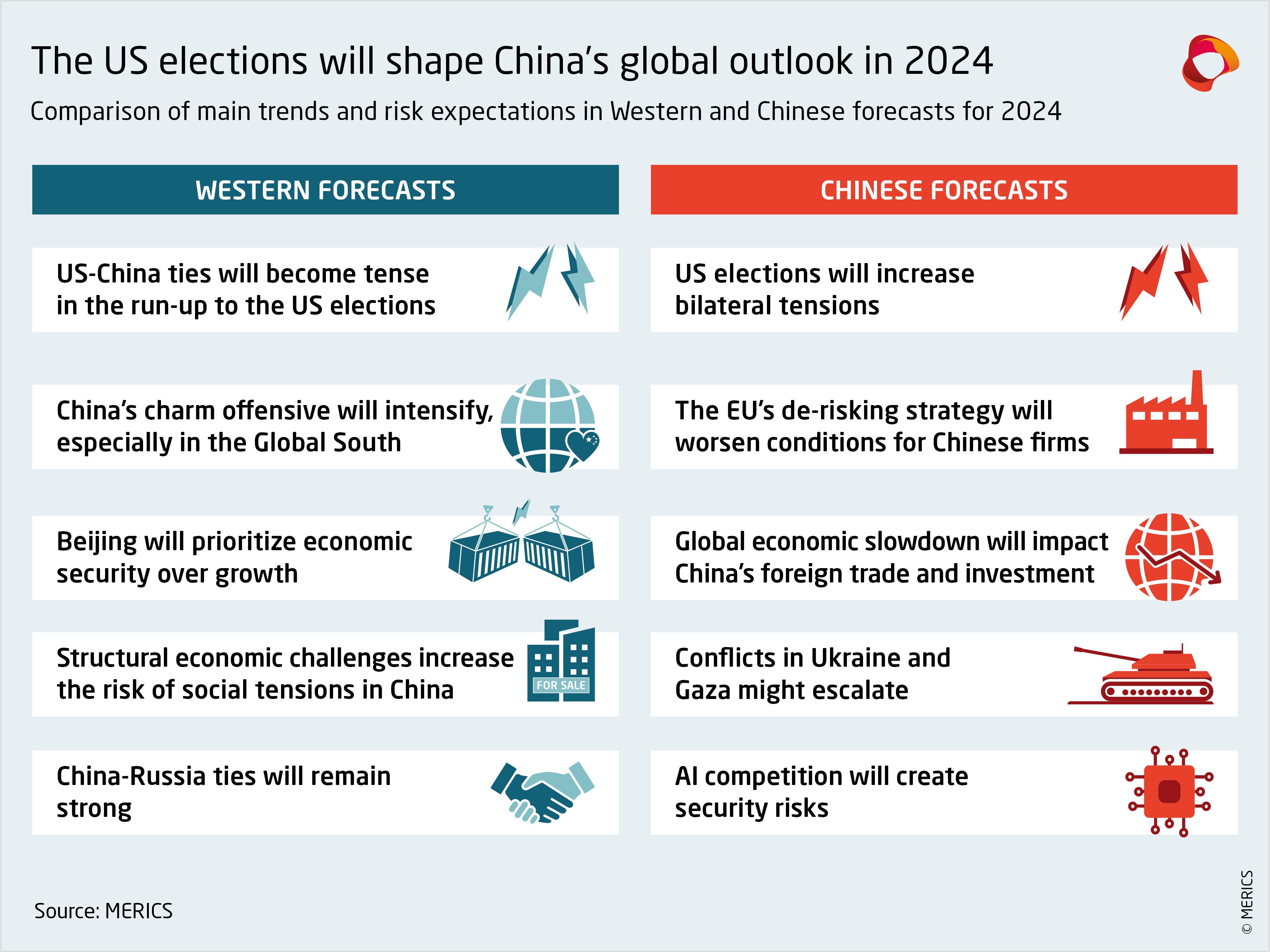 The forecasts examined here also outline Beijing’s way forward in 2024. Chinese experts expect US-China relations to worsen in the run-up to the November 2024 elections: they advocate for preserving stability, for continued engagement with the Global South and for the promotion of Xi Jinping’s new global initiatives to achieve China’s strategic objectives.
