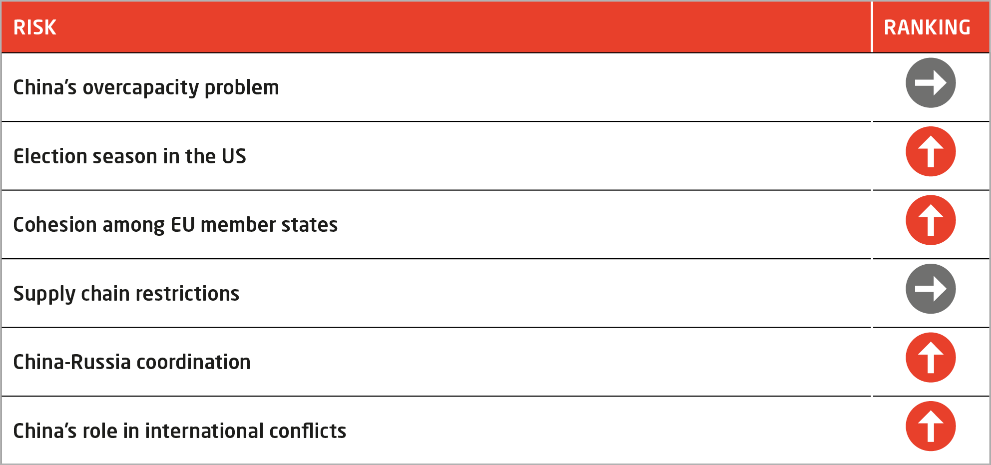 The likelihood or probable impact of some of the 2024 top China risks identified by MERICS in late 2023 continues to shift. The US Democratic Party’s changed presidential ticket, combined with both parties’ vice-presidential choices, has changed expectations on Washington’s likely China policy, whoever forms the next administration. The final vote on the EU’s tariffs on Chinese EV imports will challenge the bloc’s cohesion. And recent developments in China-Russia cooperation, and Beijing’s growing role in other conflict mediation efforts, could create new challenges for Europe. Below, we outline some key developments that have altered our risk assessments.