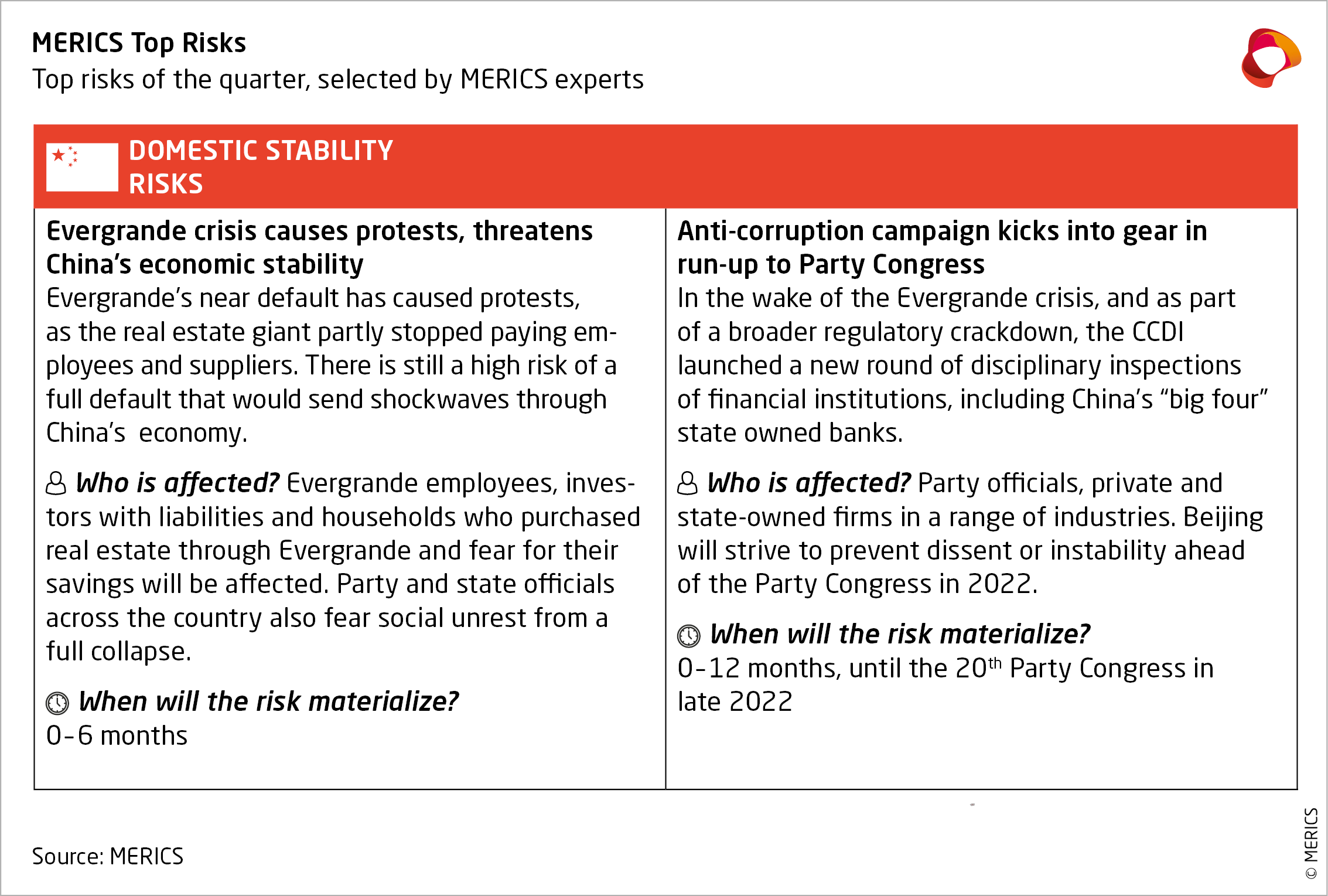 The main goal for Beijing in the months to come will be to prevent any major instability affecting the preparations for the leadership reshuffle at the next Party Congress. As the first point of business, China’s leadership is trying to tackle the economic risks facing the country amid ongoing energy shortages and the crisis engulfing debt-laden real-estate giant Evergrande, which has triggered protests from unpaid employees, suppliers and investors. Financial health checks are to be imposed on major lenders: Zhao Leji, secretary of the Central Commission for Discipline Inspection (CCDI), announced “full-scale disciplinary inspections” to safeguard the healthy development of China’s financial sector. The campaign will target 25 organizations, including China’s “big four” state owned banks.