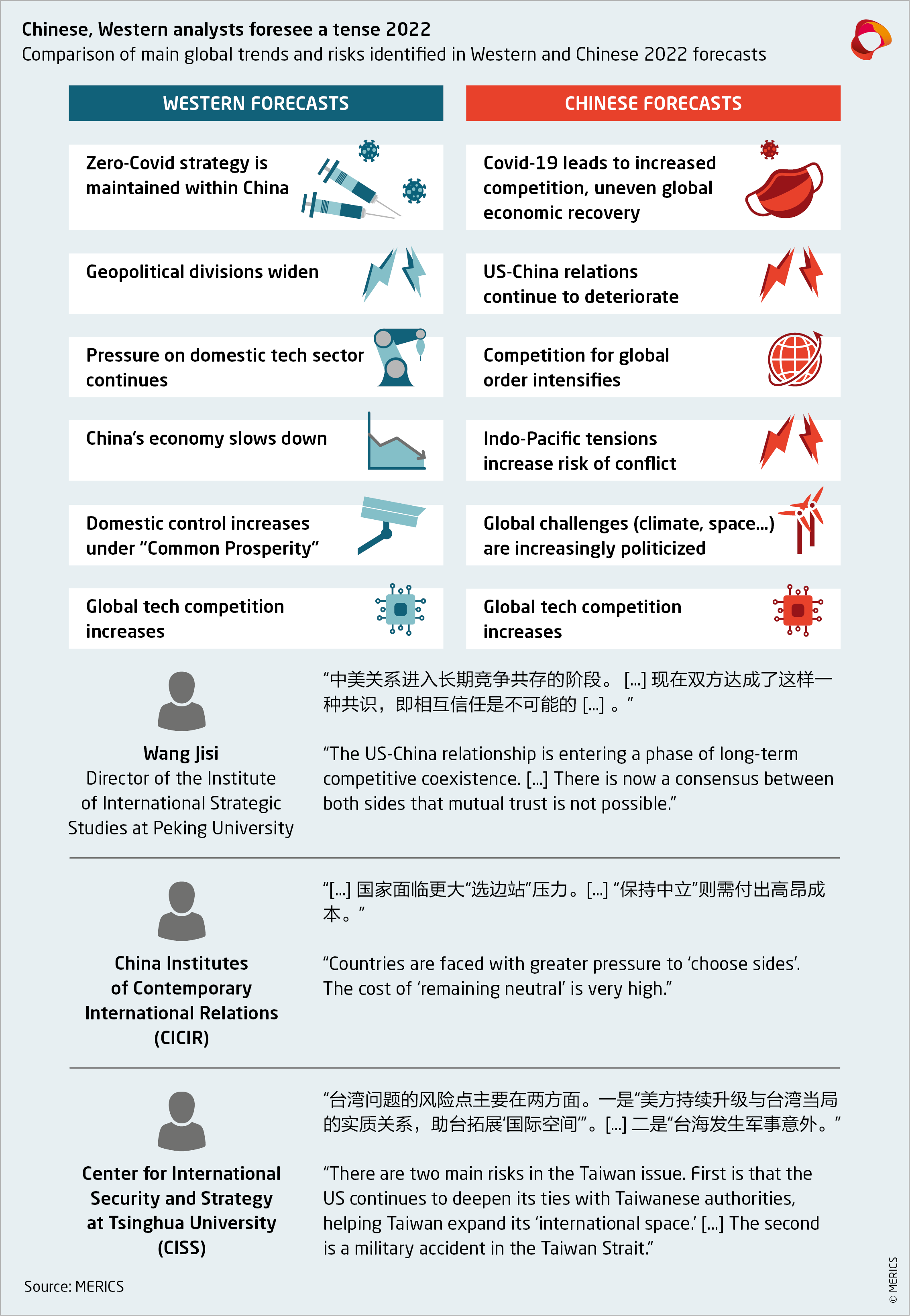 Among the main global trends predicted for 2022, Western analysts and forecasters such as the Economist, Control Risks or Eurasia Group have warned of greater decoupling and geopolitical tensions with China, as discussed in a previous piece by Roderick Kefferpütz, published on February 15.1 Here, we build a fuller picture of the year ahead by examining 2022 forecasts from two Chinese organizations – the Ministry of State Security-affiliated China Institutes of Contemporary International Relations (CICIR)2 and the Center for International Security and Strategy (CISS) at Tsinghua University.3