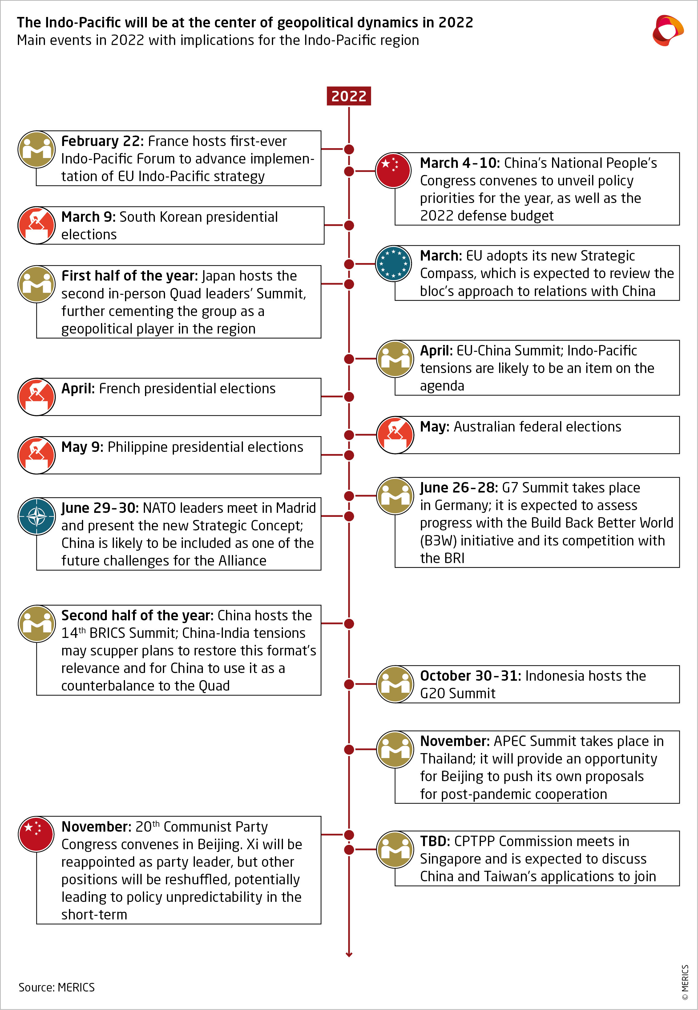 - Reforming the global governance system: Beijing will take advantage of the multiple multilateral events taking place in Asia in 2022, namely the BRICS, APEC, G20 and SCO summits, to try to promote its own views of the global order and to secure buy-in from other countries.