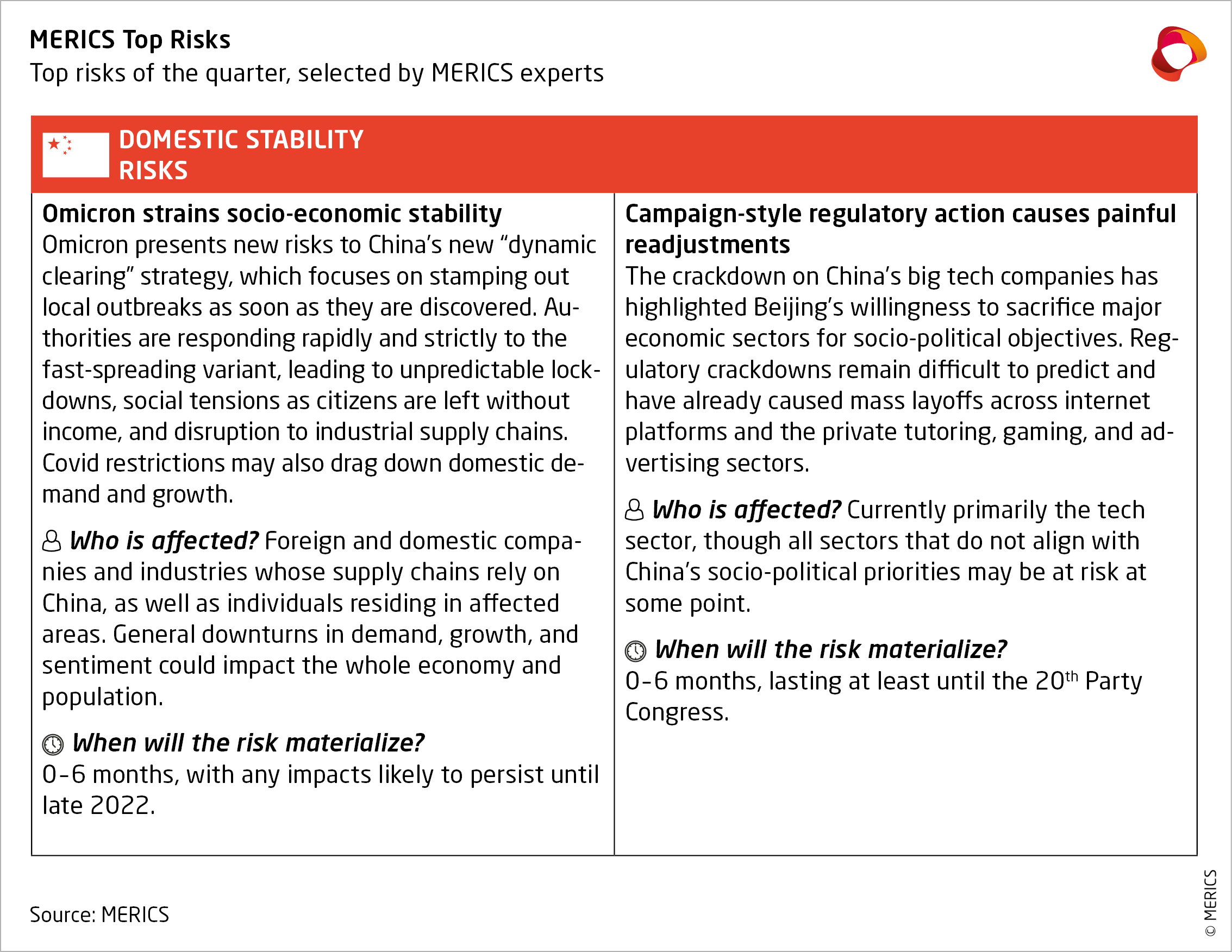 China’s continuing regulatory crackdown is exacerbating socio-economic risks too. Like the zero-Covid strategy, it is meant to bolster stability long-term. Paradoxically, the blunt campaign-style actions first escalate instability. Crackdowns on homegrown Big Tech and the debt-burdened real estate sector have led to mass layoffs at affected firms. The popular, privately-owned after-school tutoring sector has fallen out of political favor, and been shut down altogether. President Xi has signaled that the regime will not shy away from socio-economic costs emanating from regulatory actions if the outcomes support party-state objectives. It is possible that more campaign-like regulatory moves lie ahead in the run-up to the party congress in November 2022.