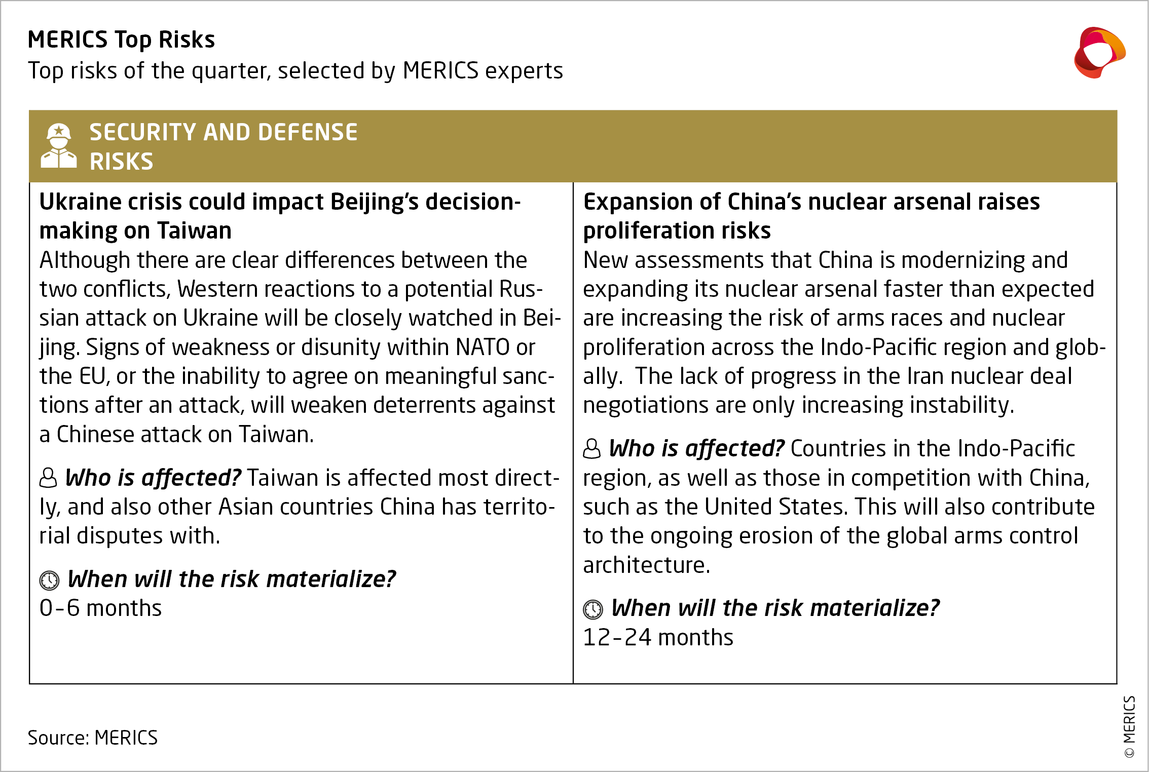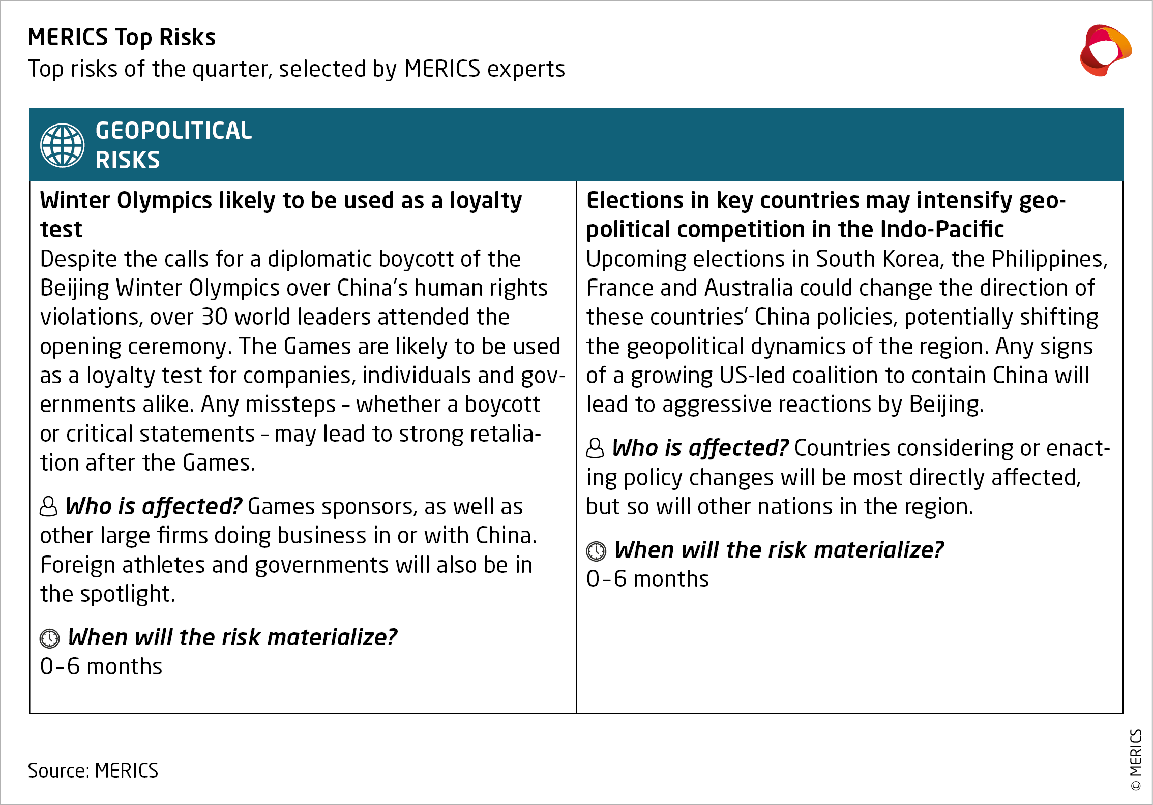 Although Beijing will mainly focus on domestic issues this year, its international policy efforts will be directed towards the areas outlined above. Efforts will be made to reduce tensions in the top risk areas, but it would be unwise to take such efforts as a sign of permanent shifts in policy direction. The CCP is simply out to ensure that nothing disrupts preparations for the 20th Party Congress.
