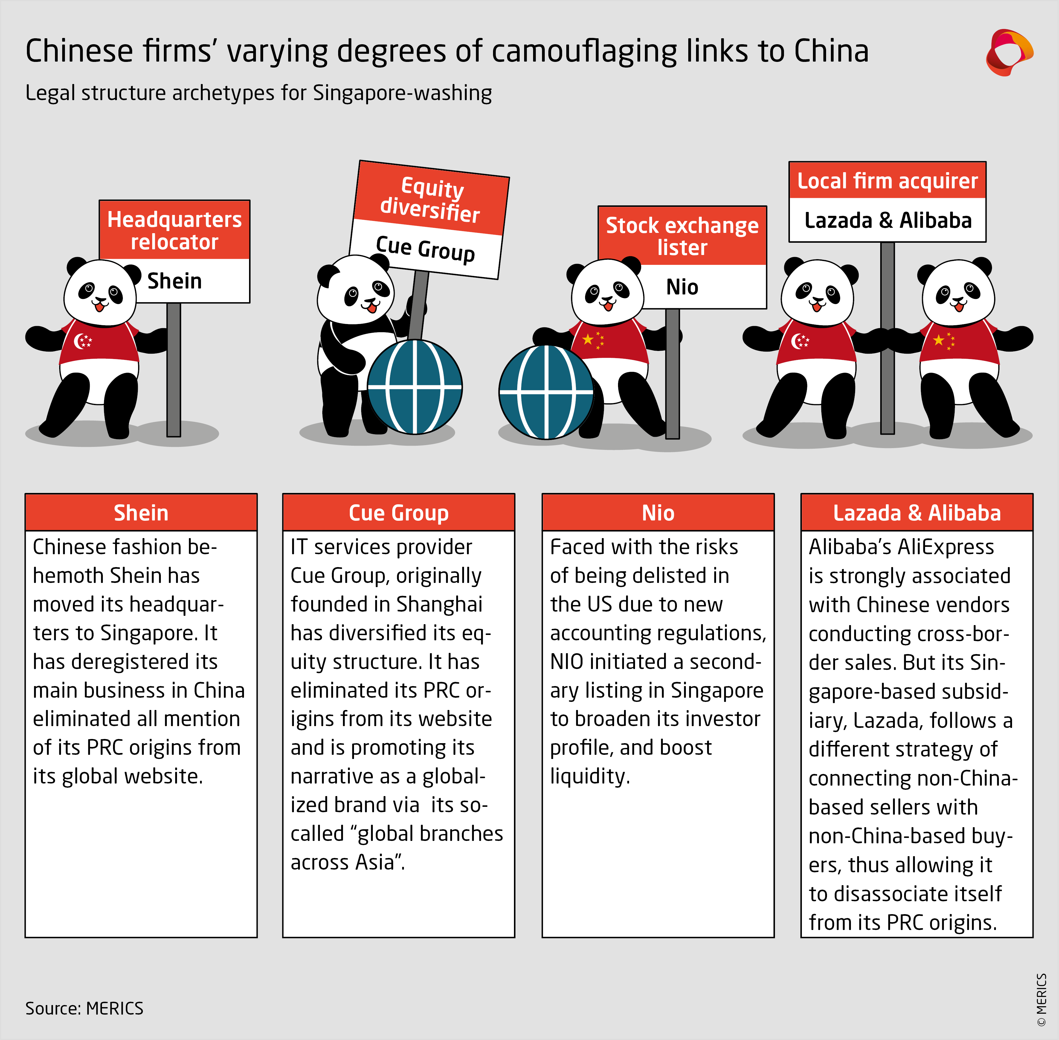 As OECD countries intensified their criticism towards corporate China, Chinese companies are confronted with navigating rising geopolitical tensions and increasingly politicized “Made in China” labels. Some foreign firms in China are trying to make their local operations separate from their global operations, and some to even look as 'Chinese' as possible to mitigate an increasingly politicized global business ecosystem. Just like their foreign counterparts, Chinese firms are future-proofing their businesses, specifically, by using Singapore as a hub to camouflage links to China or adjusting their takes to globalization in various ways. The spectrum of approaches span from keeping the Chinese brand and just shifting their global headquarters to Singapore and decoupling China from global operations, to all the way companies trying to 'appear non-Chinese'.