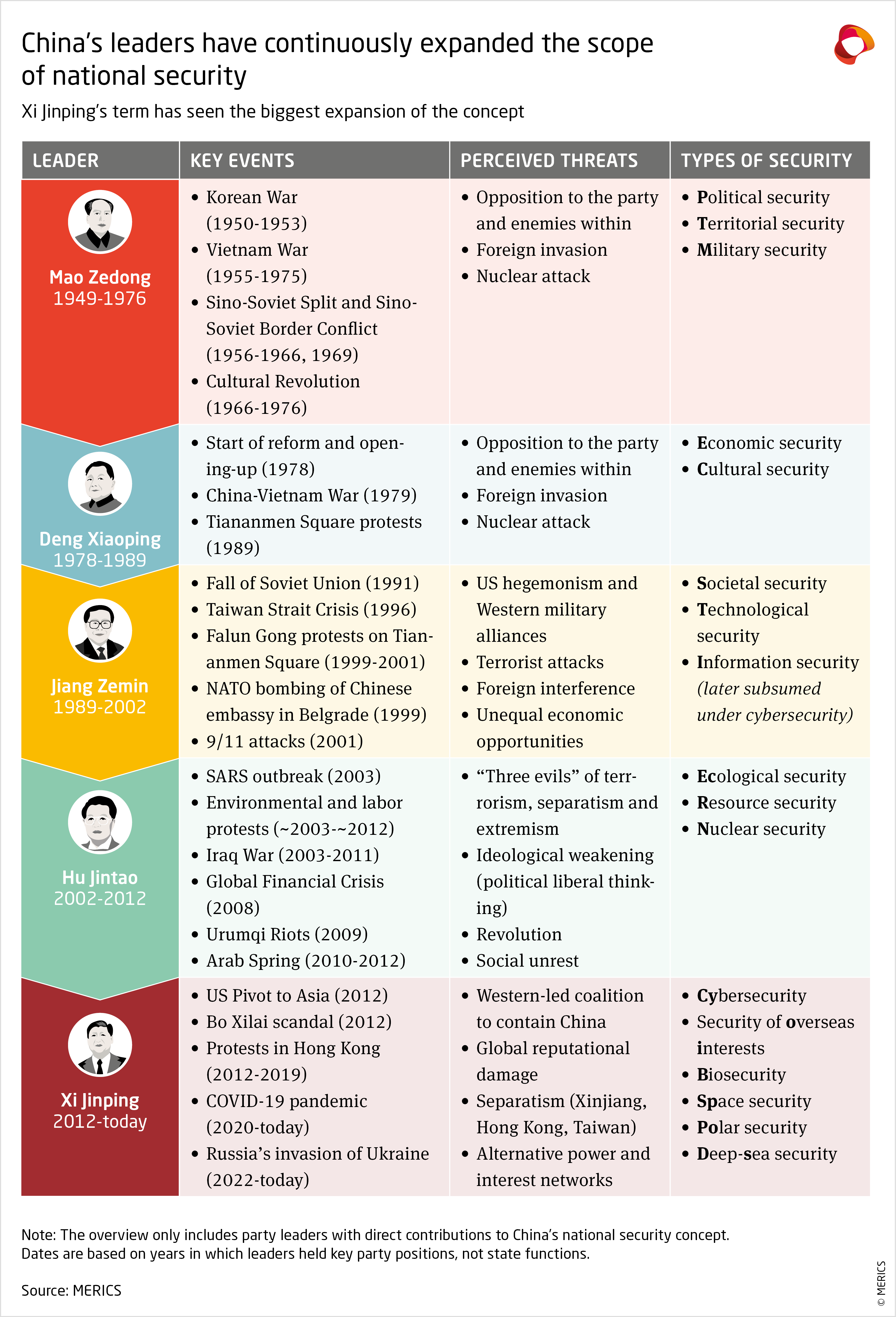 - Xi’s national security outlook builds on the legacy of previous leaders. From Mao to Xi, China’s leaders have continuously added new types of national security, but the overarching mission has remained to defend the CCP’s hold on power and political stability.