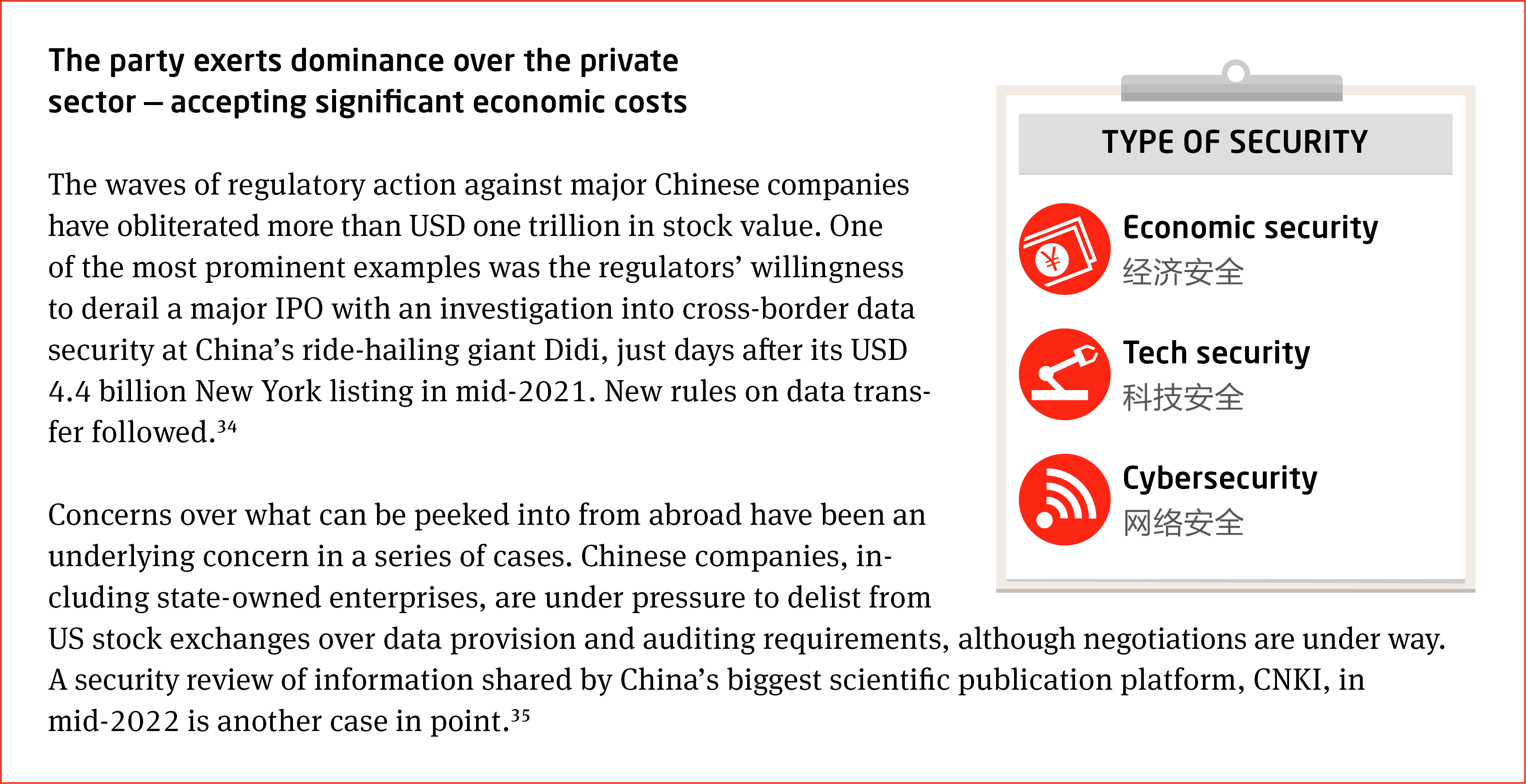 The leadership is well-aware that China is entering an era of slower economic growth and seeks to ensure China’s technological self-sufficiency and increase the party state’s steering capacity over the economy. Since 2020, government organs have carried out waves of private sector regulation to discipline companies, align their actions with party priorities, strengthen party influence and prevent the formation of power bases outside the CCP.